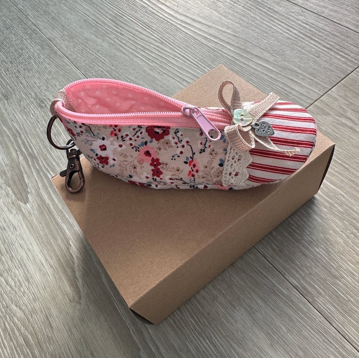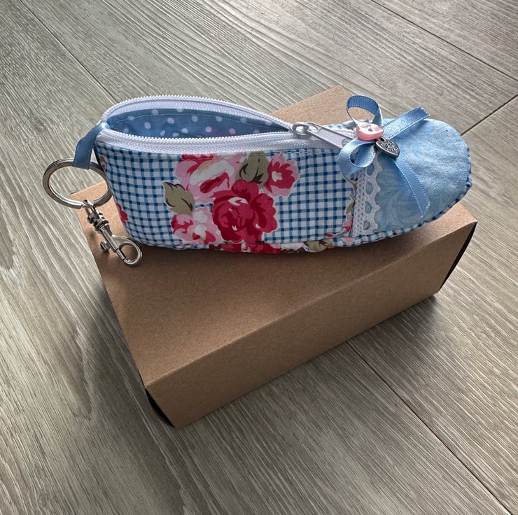 Made from fabric and fully lined throughout, this little purse features lace trim, a contrast toe cap, and a front zip opening to keep coins, keys, or small essentials safely tucked away. Finished with a button and bow detail and a ‘Made with Love’ metal heart charm, it’s packed with little details that make it feel really special.