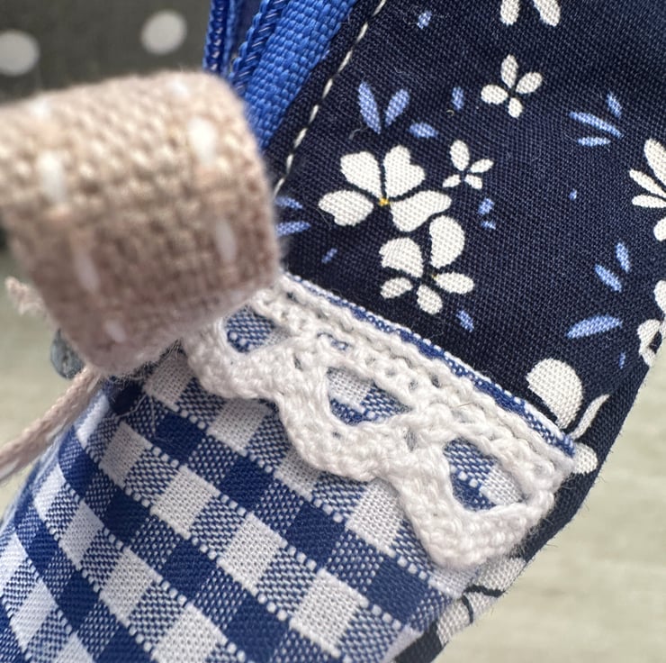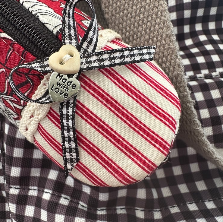 Made from fabric and fully lined throughout, this little purse features lace trim, a contrast toe cap, and a front zip opening to keep coins, keys, or small essentials safely tucked away. Finished with a button and bow detail and a ‘Made with Love’ metal heart charm, it’s packed with little details that make it feel really special.