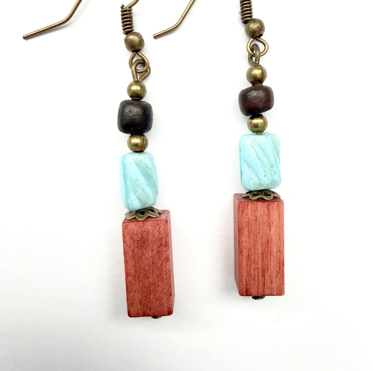 Light brown, light blue and dark brown boho style dangle drop bead earrings handmade using up-cycled and shop brought beads.
