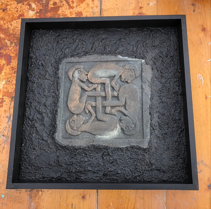 The figures are in resin with a patinated bronze finish and the backing is of Bog Oak, that being thousands of years old.