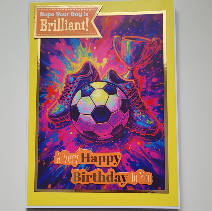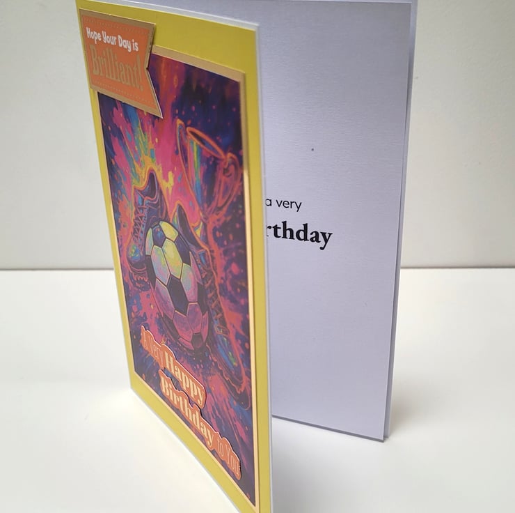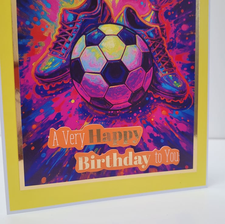 This bold and bright card would stand out beautifully on display. Ideal for a son, grandson, nephew, brother, or friends who can’t get enough of the beautiful game.