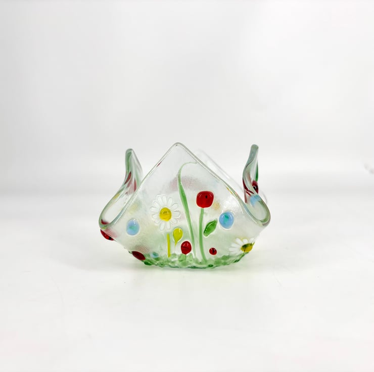 It has been fired in stages and on its final visit to the kiln it is put over a mould and when it heats the glass drapes into folds giving it its gorgeous handkerchief shape.