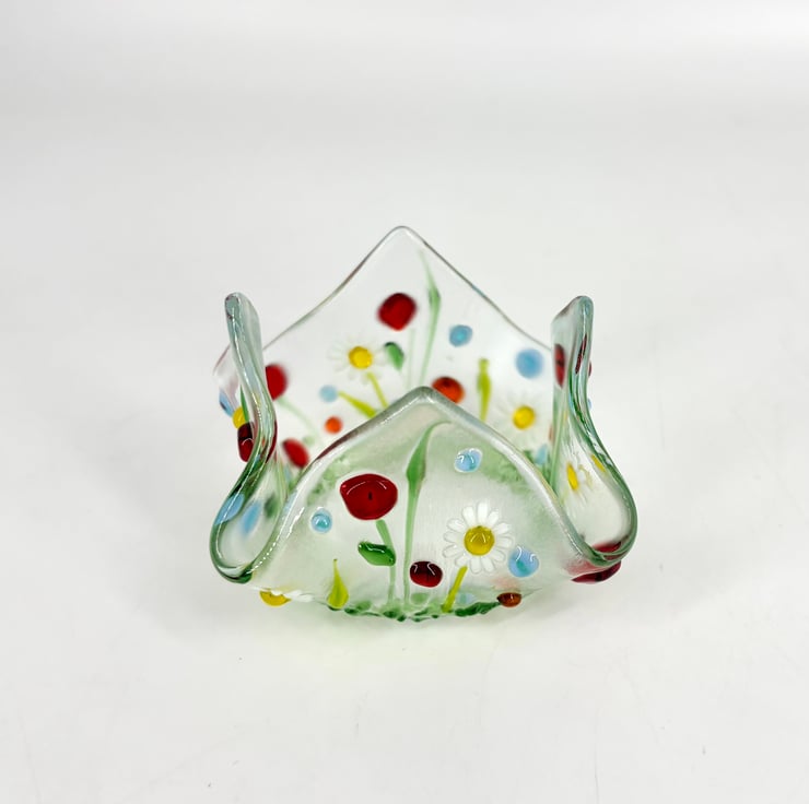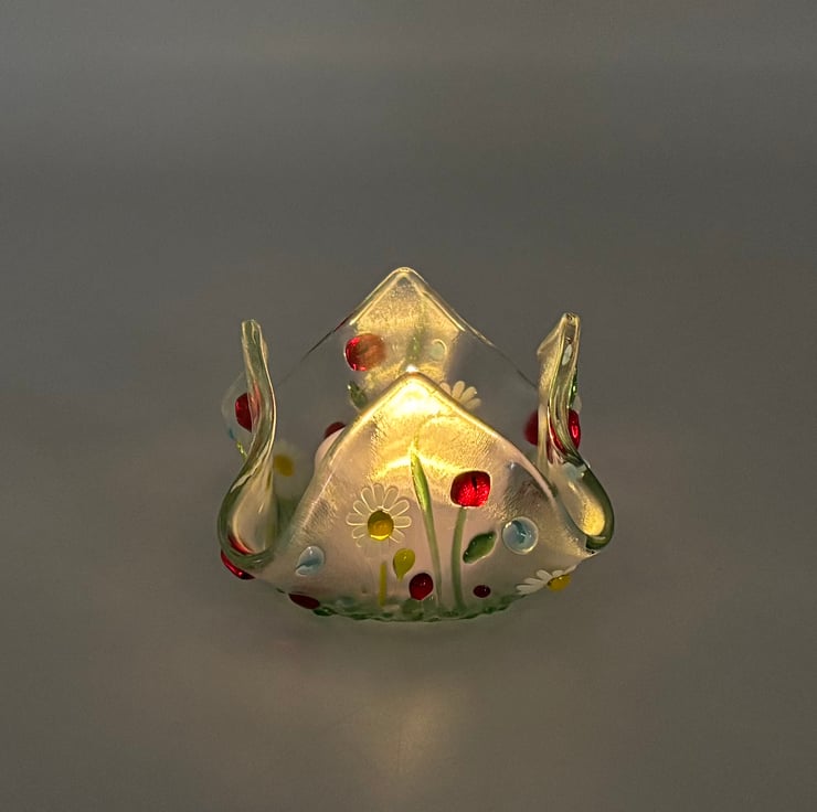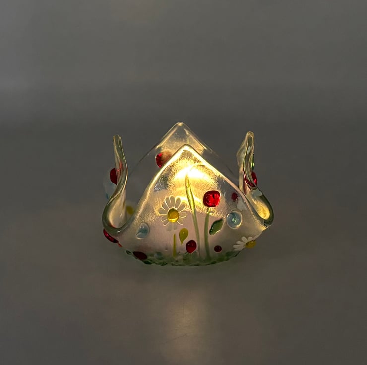 A lovely little tea light holder with a floral lamp worked glass design.
