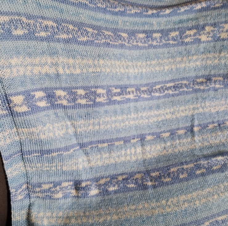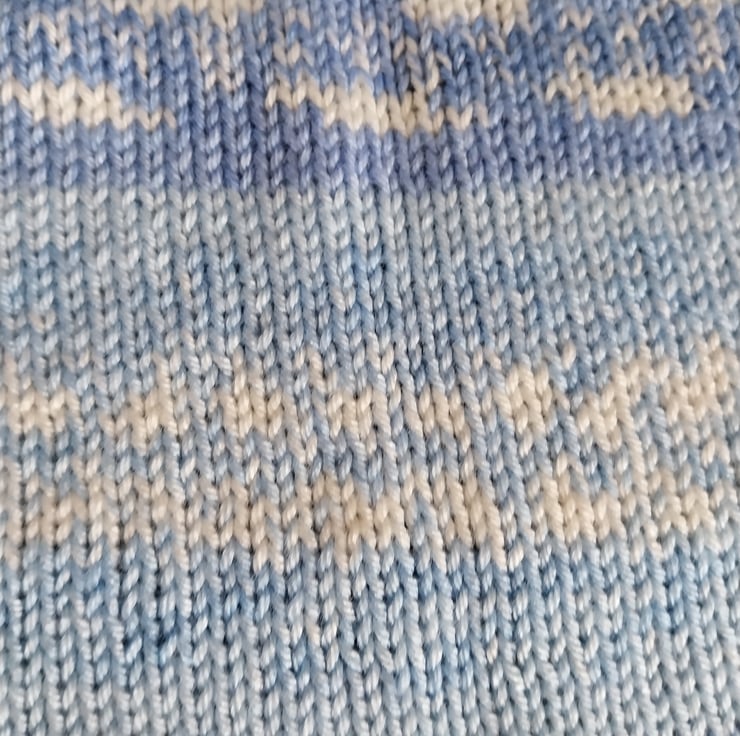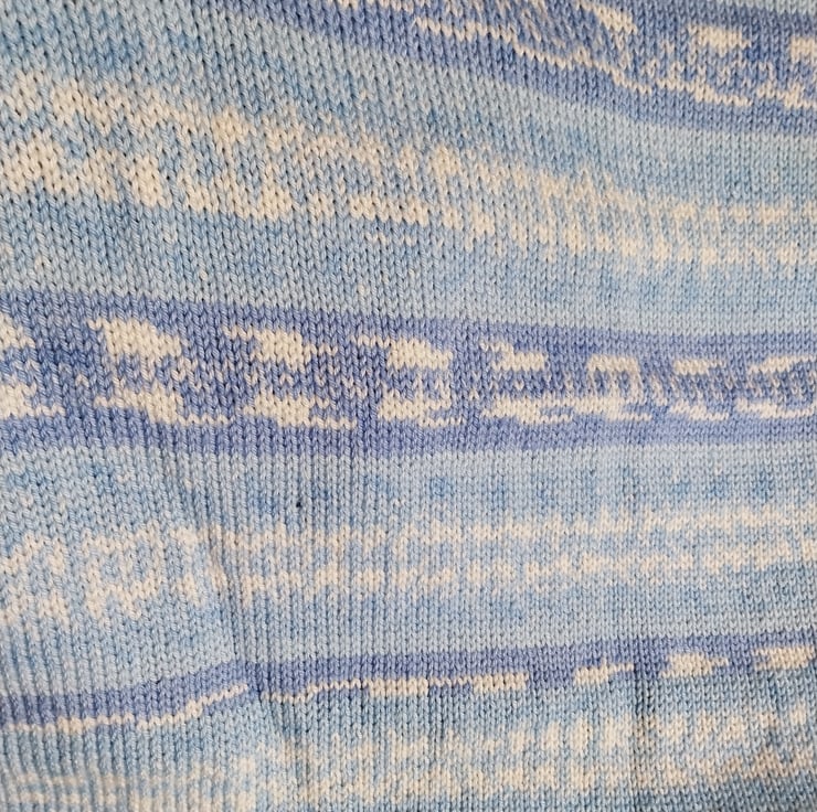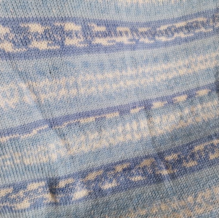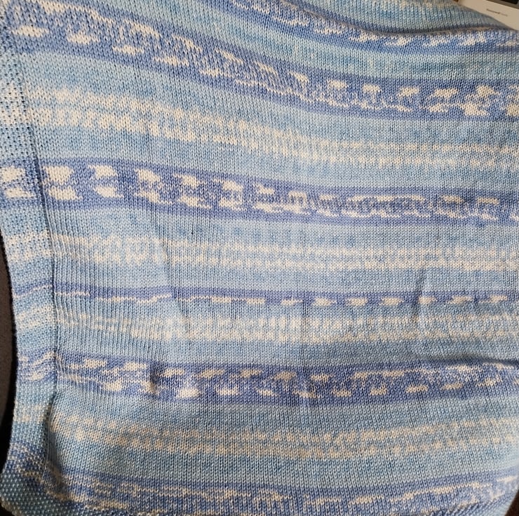 This hand knitted baby blanket is made slowly and carefully, with care in every stitch. The soft blend of gentle blues and creamy tones creates a calm and timeless look that works beautifully in any nursery.