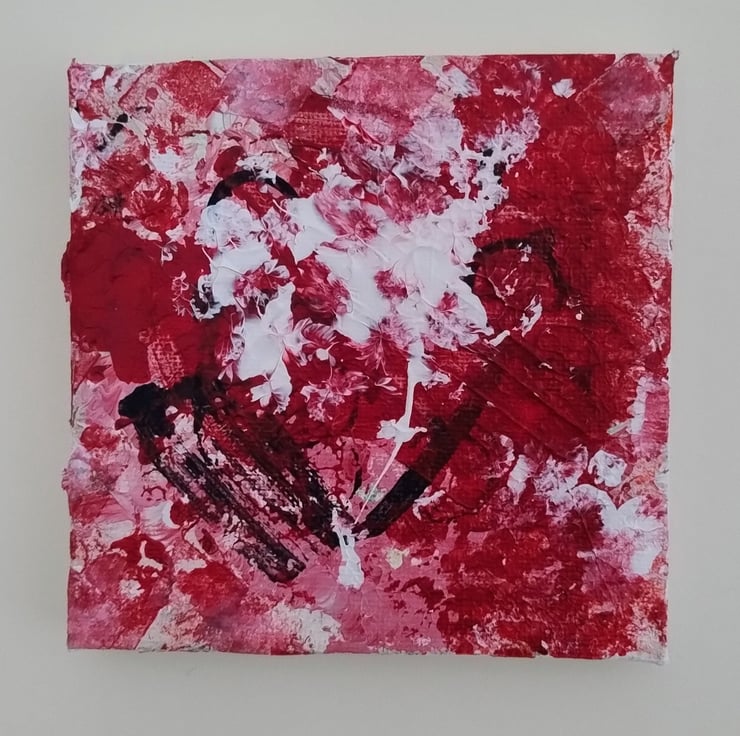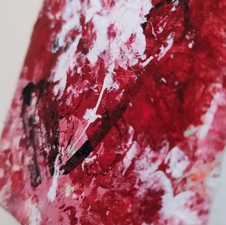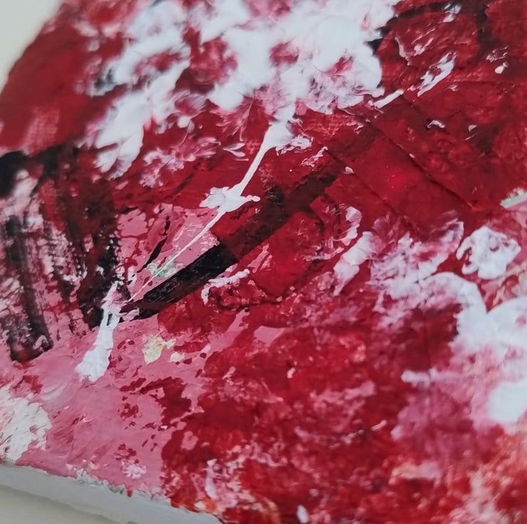 This painting evolved into a study of contrast and texture. I’ve used a mix of bold reds and crisp whites to create a statement piece that feels both modern and deeply personal. Each mark is unique. This small painting is part of a series and would be perfect for adding a pop of character to a smaller wall or a quiet corner.