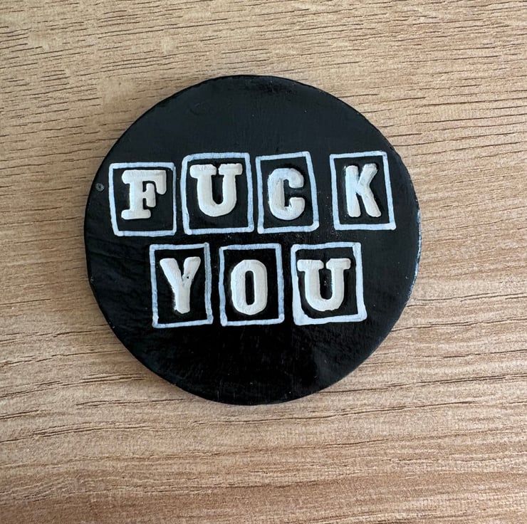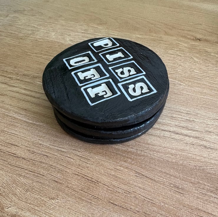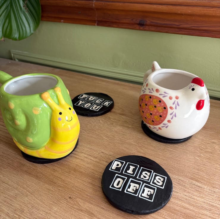 Handmade, air dry clay, set of four coasters with rude phrases. Fuck you, piss off, dickhead and bullshit.