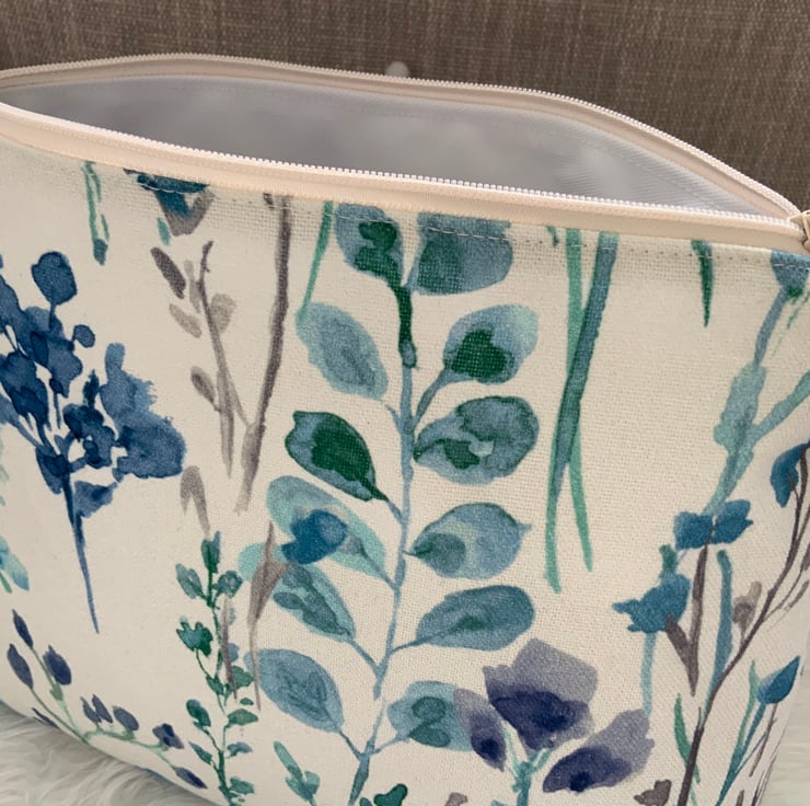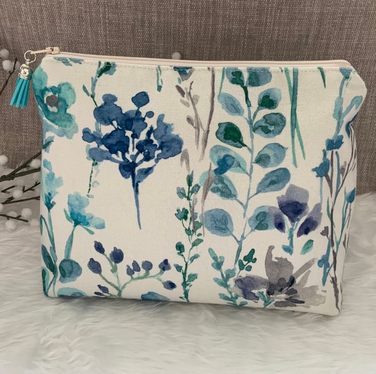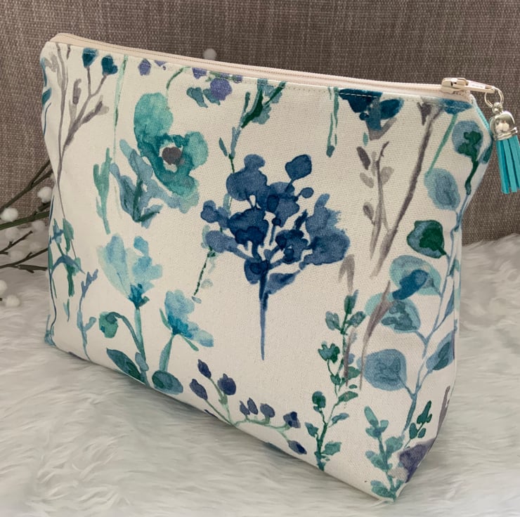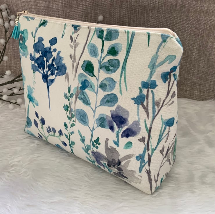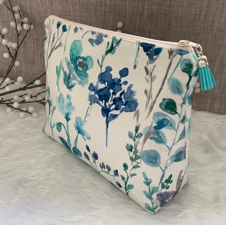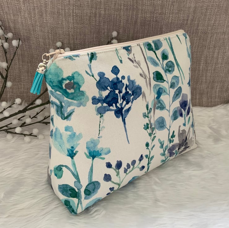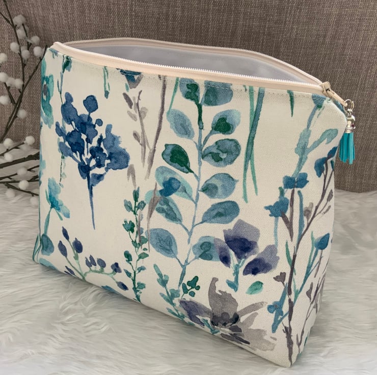 A gorgeous wash bag, perfect for storing your toiletries or cosmetics. It would look stylish on display in a bathroom or on a dressing table but also perfect as a travel accessory to carry your toiletries. This bag is lightly interfaced and is lined with a white waterproof fabric. The zip is finished with a matching tassel.
