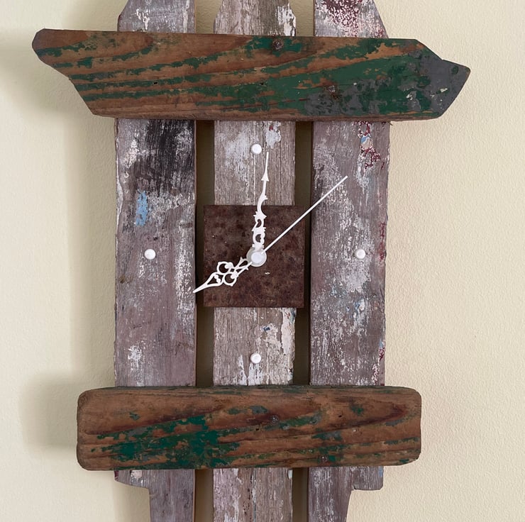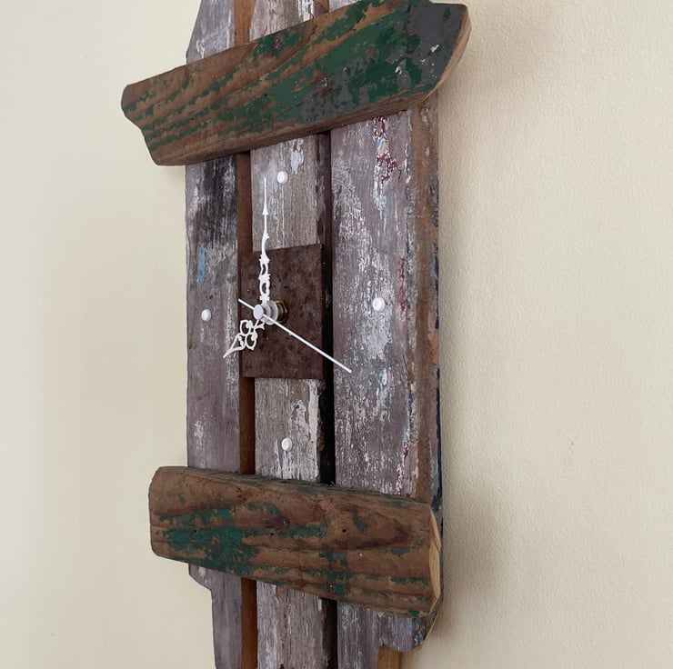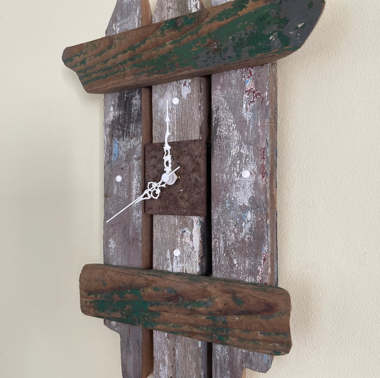 With oceanic influences this driftwood clock has been handcrafted and designed by myself Driftwood reflections. Its originality reflects on carefully chosen bits of wood sourced on the west coast of the UK. Bringing a sense of calm to any room ordained with such an original Work. This piece is completely unique and one of the kind. The detail on the face is of weathered painted Driftwood and a rusting steel plate, bringing together a natural and lovely piece of time art.