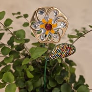 Made from upcycled aluminium can pulls, cotton embroidery floss and glass beads. The wire leaf is wrapped in wire and glass beads.