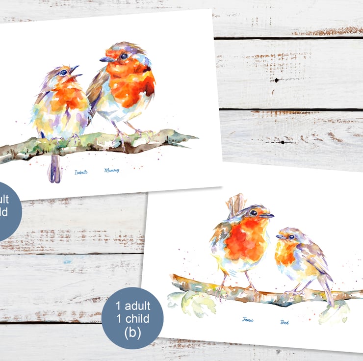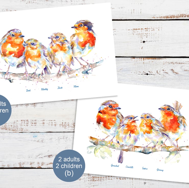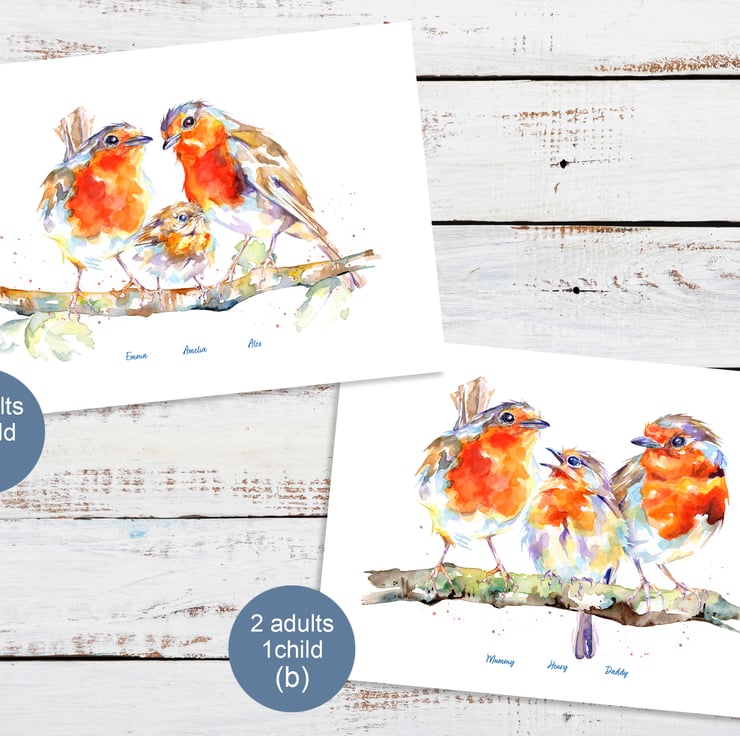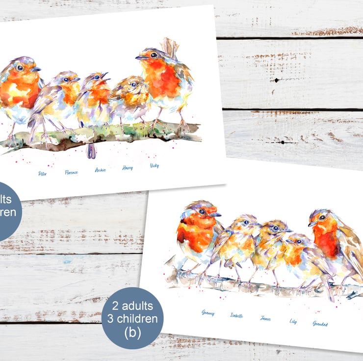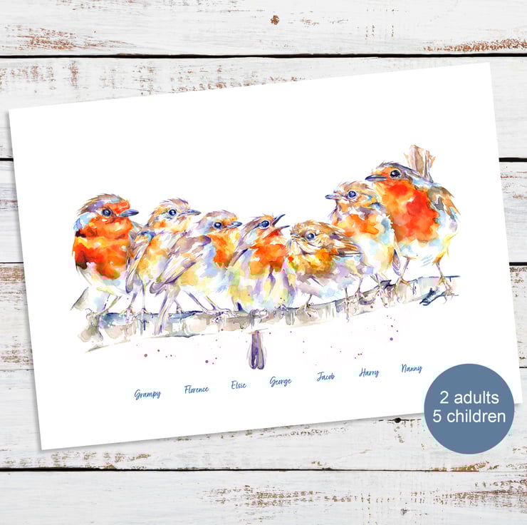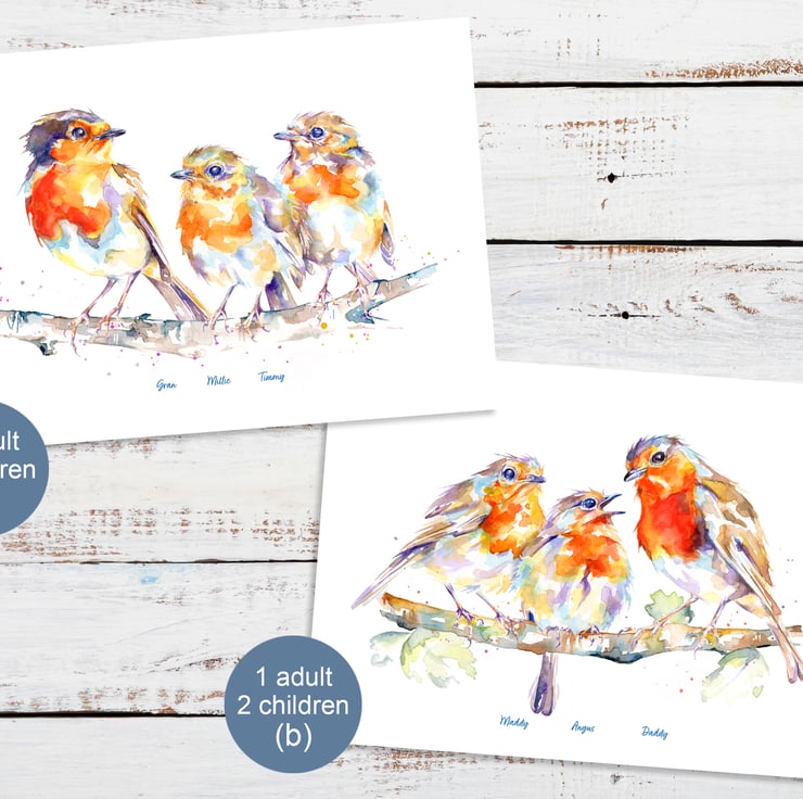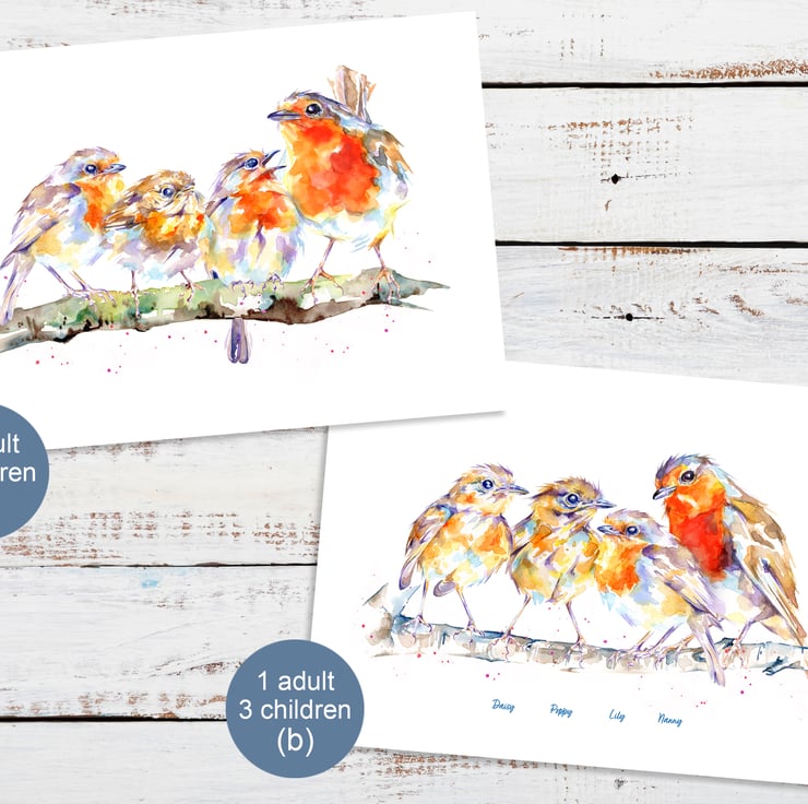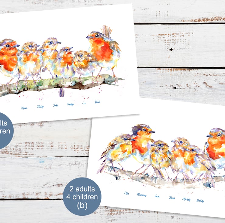 Personalised robin family portrait. This beautiful robin family creates the perfect gift - multiple group combinations available for up to 2 adults and 5 children. Produced from my original watercolour paintings and printed professionally using museum quality inks.