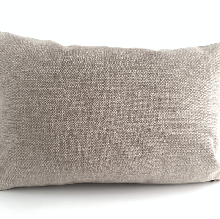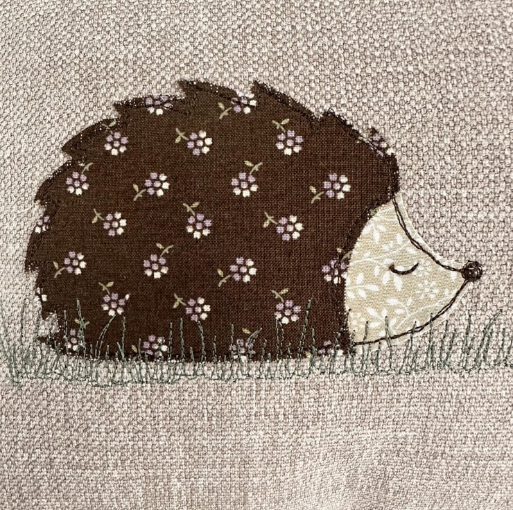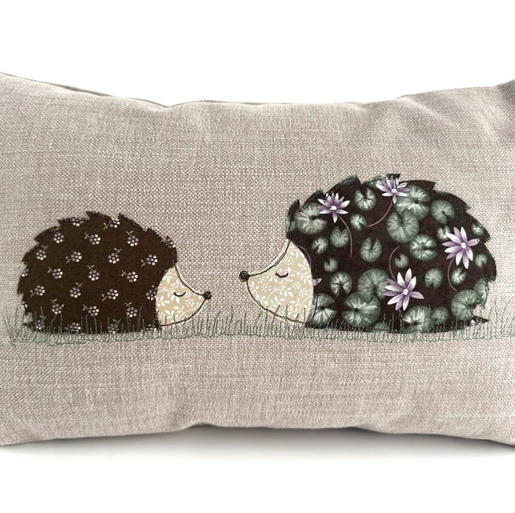 Hedgehogs cushion. A lovely rectangular cushion in taupe upholstery fabric with an appliqué scene depicting two hedgehogs, sitting nose to nose in long grass. One hedgehog is slightly larger than the other. They are both made from co-ordinating fabrics. The larger one is chocolate brown with a pattern of lilac water lilies and green lily pad leaves. The smaller hedgehog is chocolate brown with a pattern of ditsy lilac flowers with green stems and leaves. They both have beige heads with a ditsy white floral pattern. I’ve outlined the hedgehogs with free-motion embroidery, which I’ve also used for their noses and sleepy closed eyes. The grass is also free-motion embroidered in green thread, the same shade as the lily pad leaves. The cushion cover has a concealed zip along the bottom and comes with a polyester hollow fibre cushion pad.
