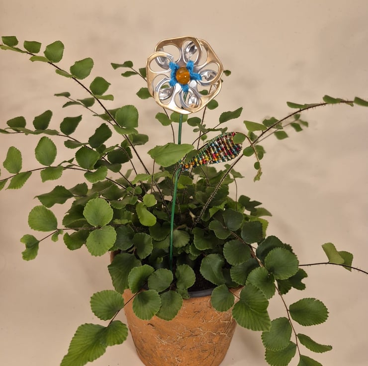 Made from upcycled aluminium can pulls, cotton embroidery floss and glass beads. The wire leaf is wrapped in wire and glass beads.