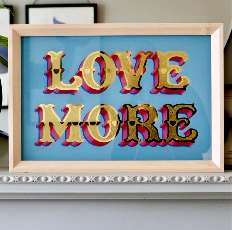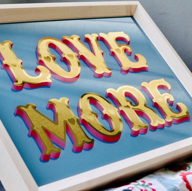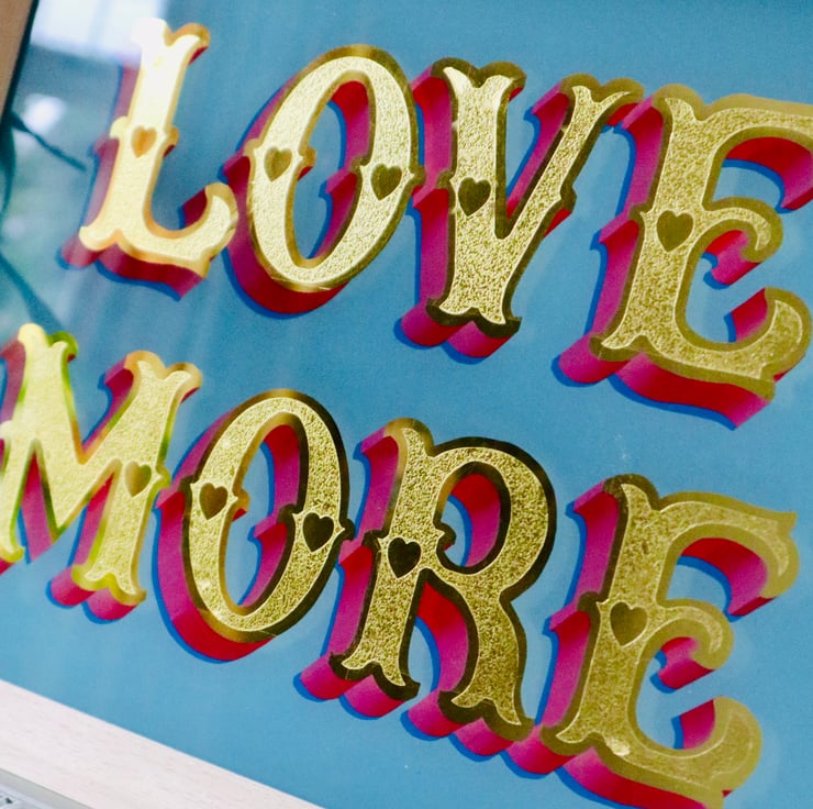 A handcrafted gold leaf wall art sign featuring the words Love More, made using traditional reverse glass gilding techniques. The design is hand painted onto acid etched glass and finished with genuine 23ct gold leaf lettering, giving a rich, luminous finish that reflects the light beautifully