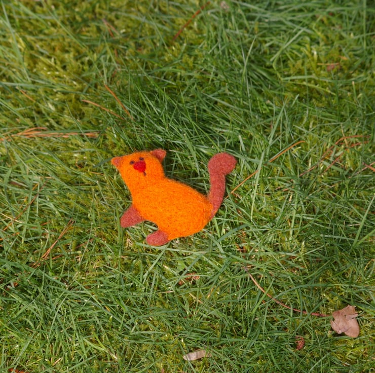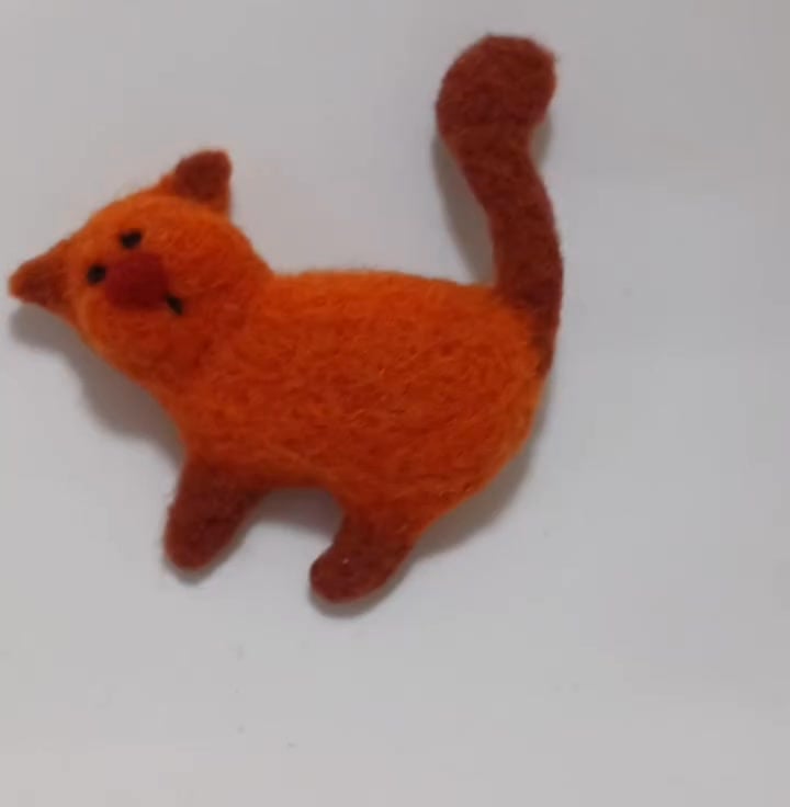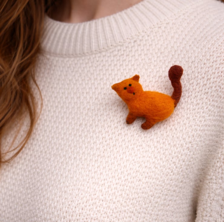 Adorable handmade brooch in the shape of a ginger cat carefully crafted from natural wool using the needle felting technique where the wool is shaped and compacted with a special felting needle