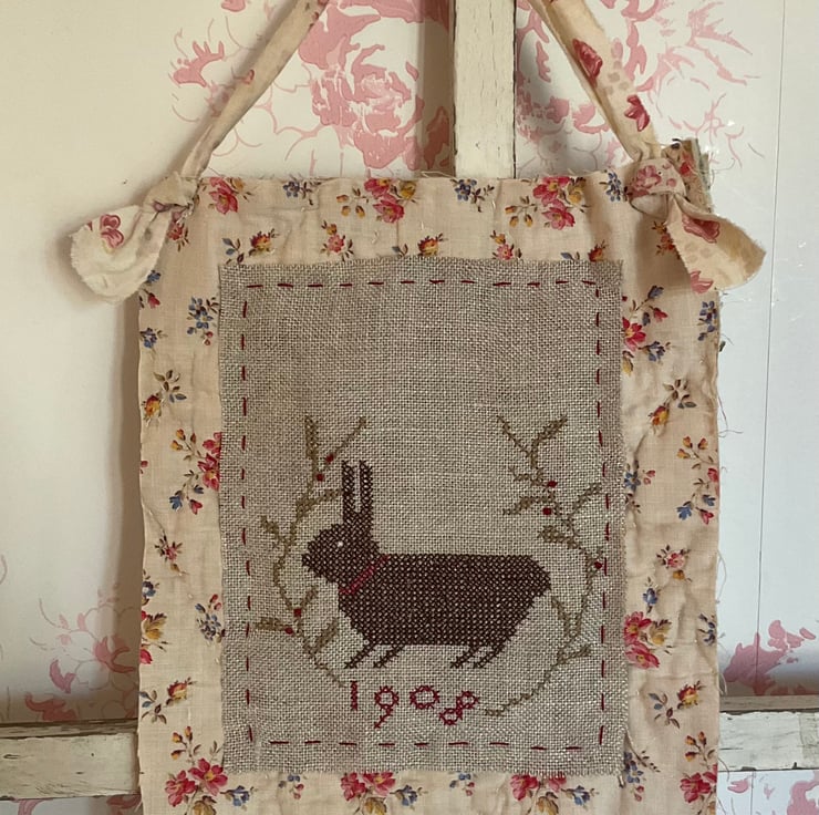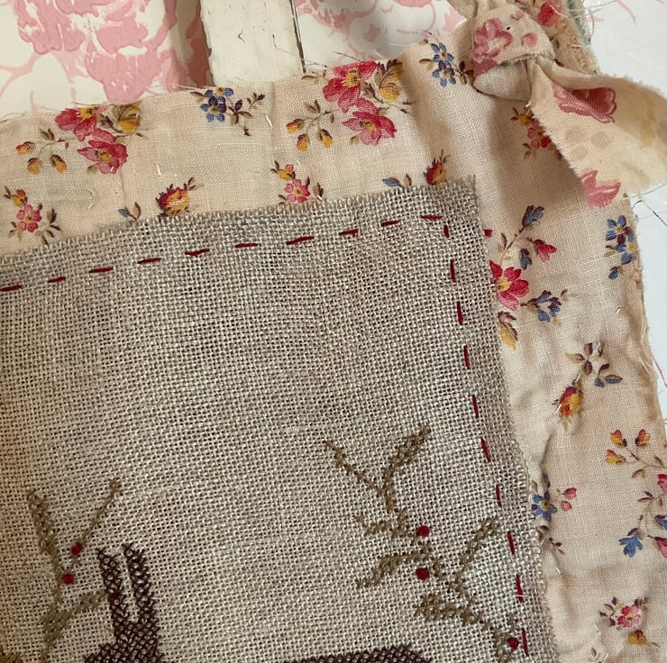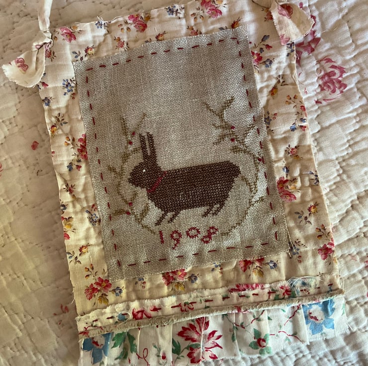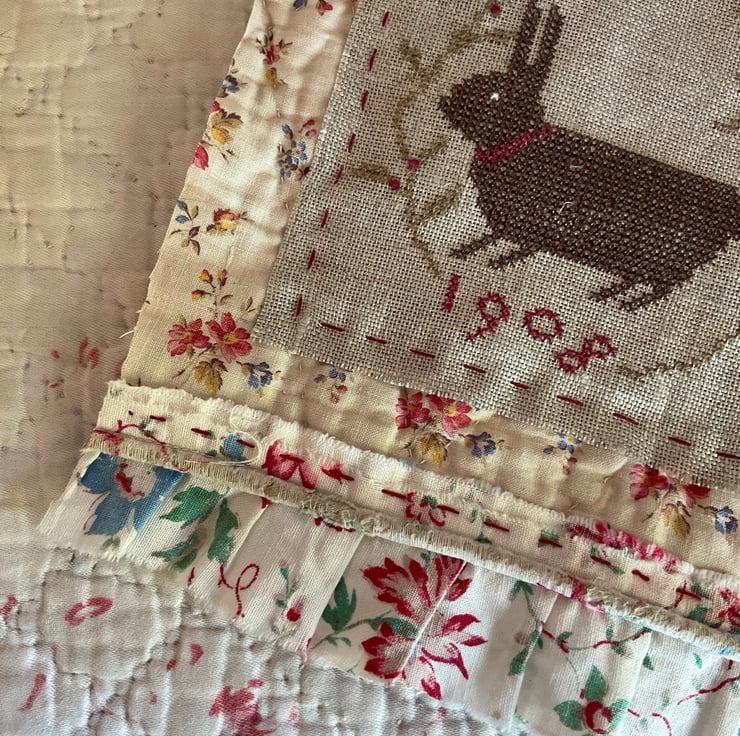 A gorgeous seasonal cross stitch on counted linen, displayed onto a piece of antique quilt, which is floral on both sides. The embroidery is attached with a running stitch, and all edges are left raw. The quilt piece is trimmed at the bottom with an antique floral cotton fabric, pleated frill and piped strip.