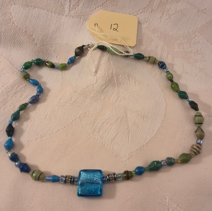 Handmade from paper and glass beads, threaded using beading thread. It is 43cm long.