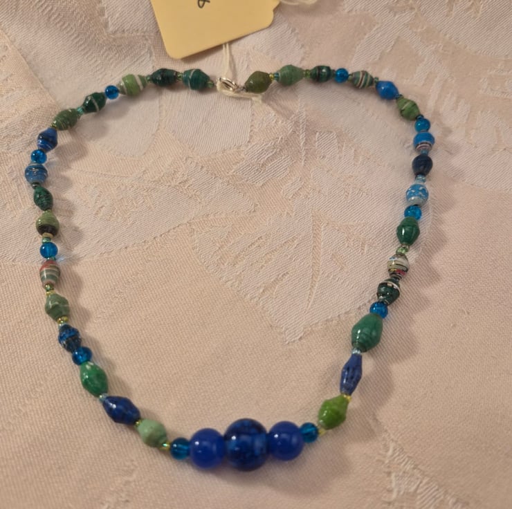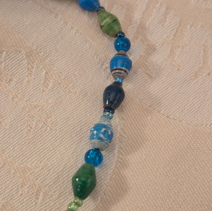 Handmade from paper and glass beads, threaded using beading thread. It is 37cm long.