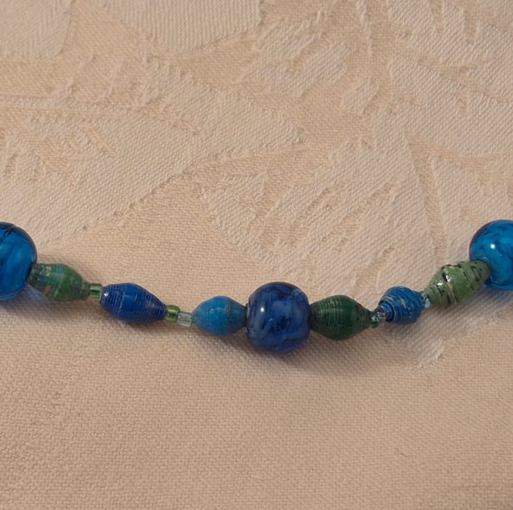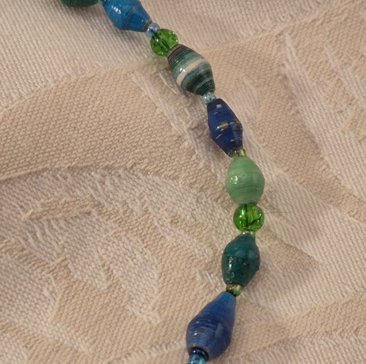 Handmade from paper and glass beads, threaded using beading thread. It is 43cm long.