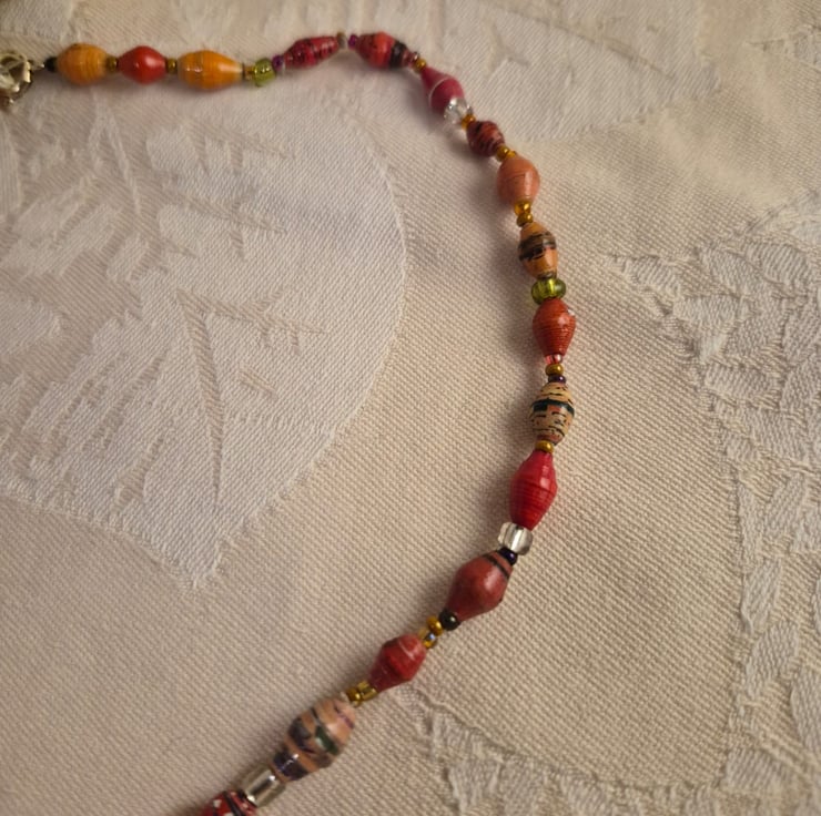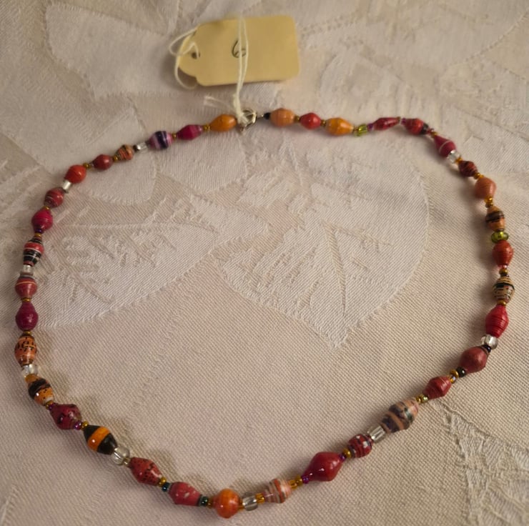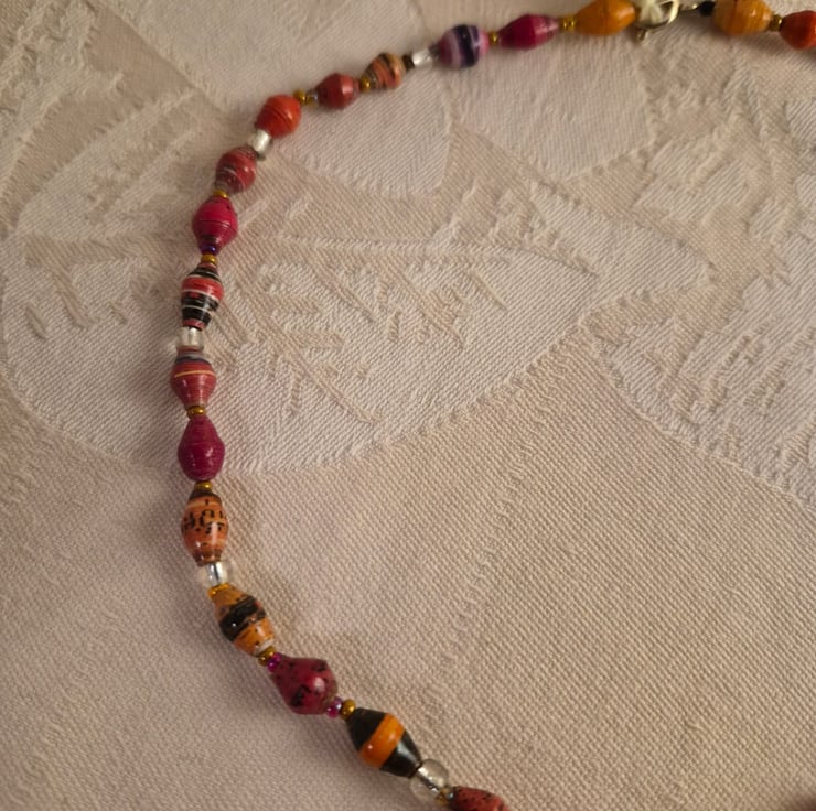 Handmade from paper and glass beads, threaded using beading thread. It is 41cm long.