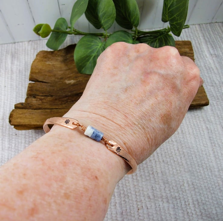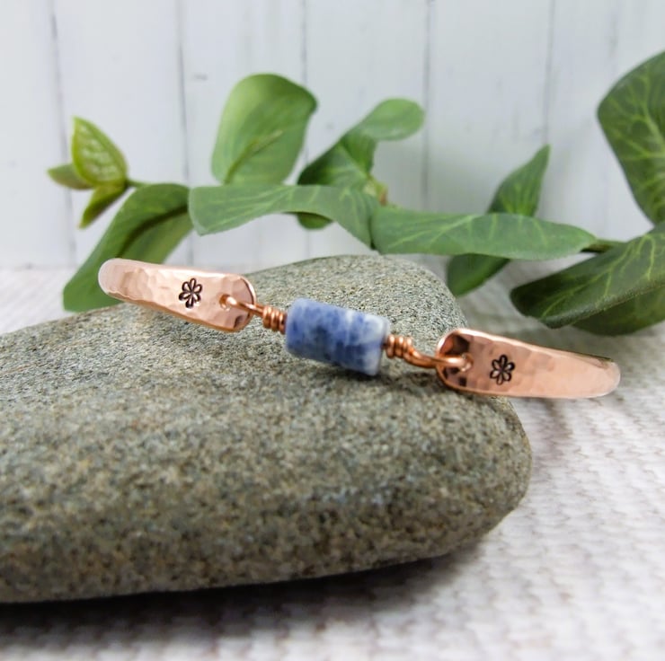 I have made the bangle from 4mm solid copper wire which I have flattened and shaped the ends and hand stamped some hearts and given the bangle a hammered texture. At the centre of the bangle I have securely wire wrapped a sodalite gemstone bead. The bangle does not open and close and is designed to fit over your hand, please refer to the size guide photograph.