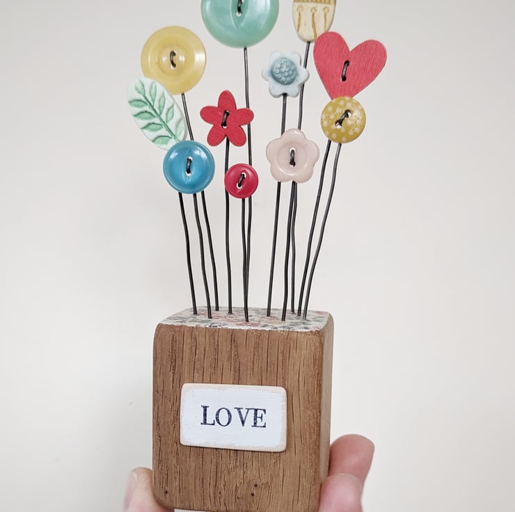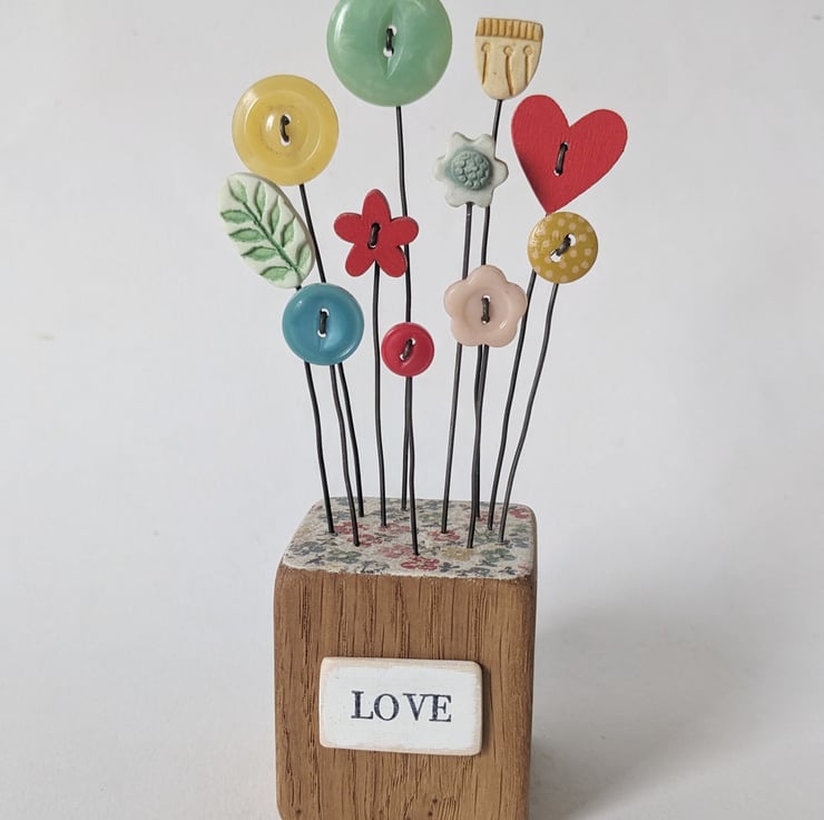 Vintage and wooden button flowers make up a happy garden.