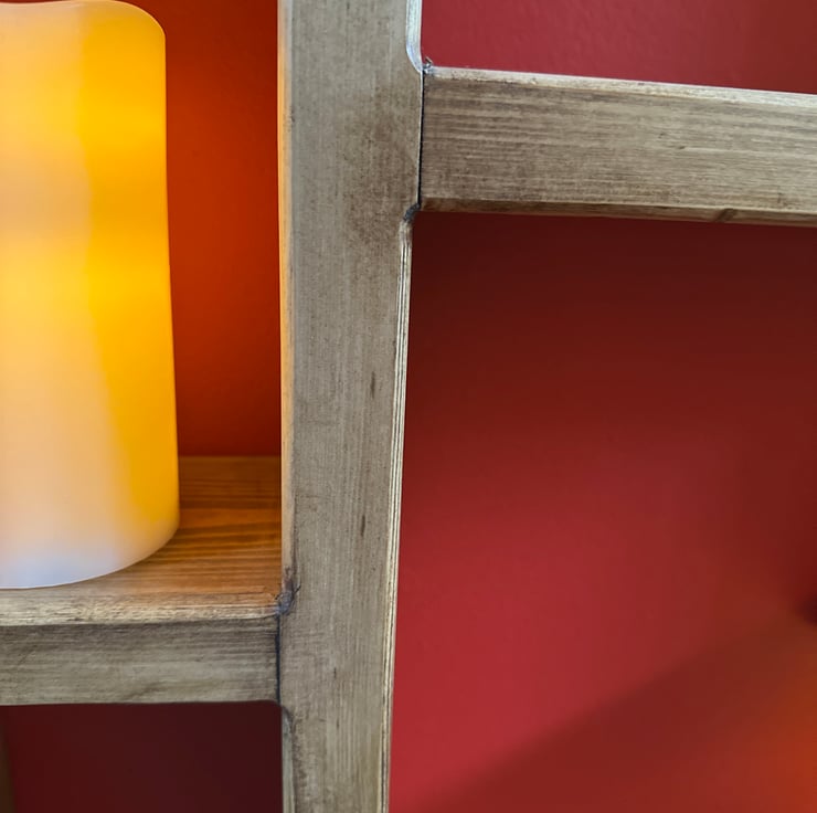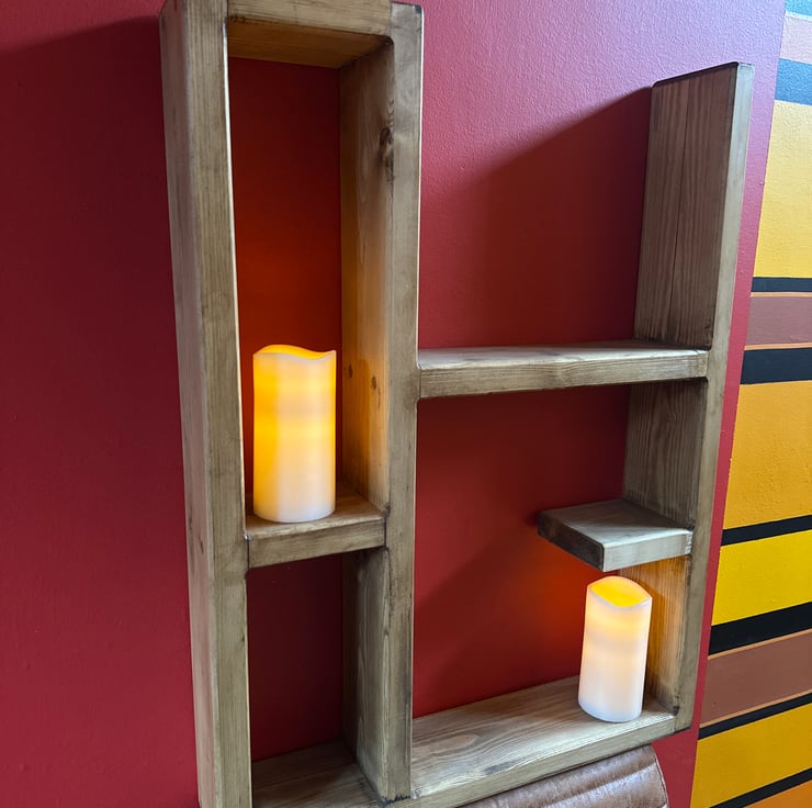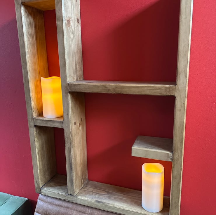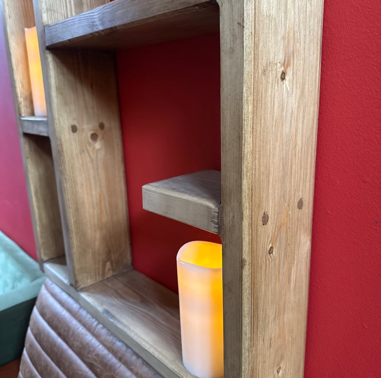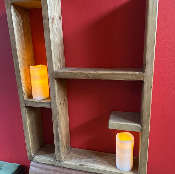 A beautiful rustic wall display unit , would look beautiful with fake candle or two and real flowers hanging from it .