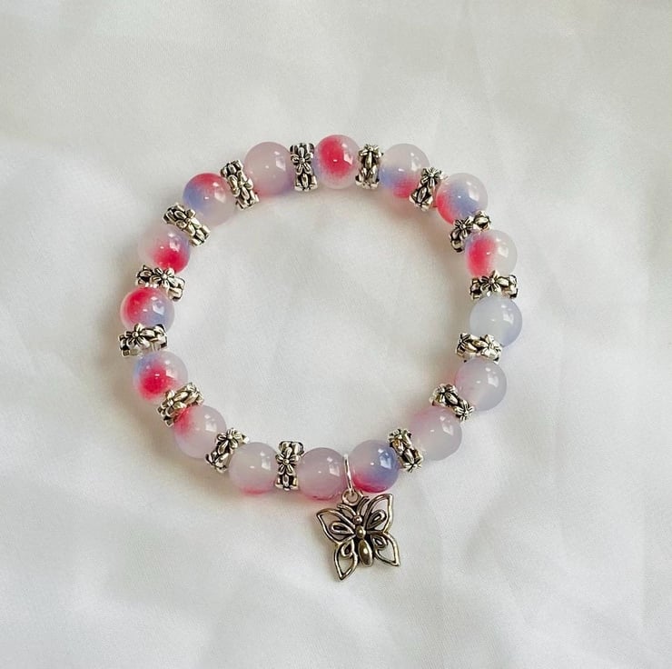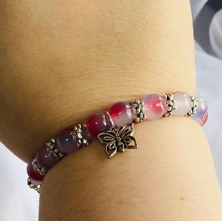 Lilac Bloom is a one of a kind glass bead bracelet featuring soft lilac and pink tones, finished with a delicate butterfly charm. A gentle, feminine piece designed to feel light, calm, and special.