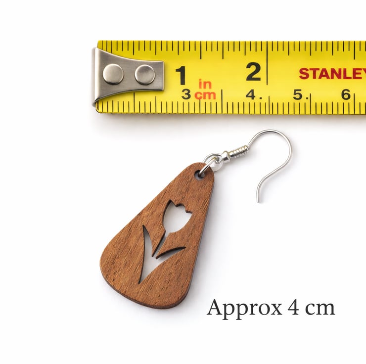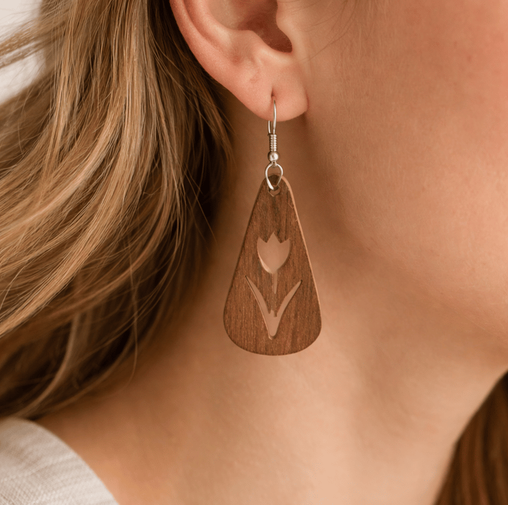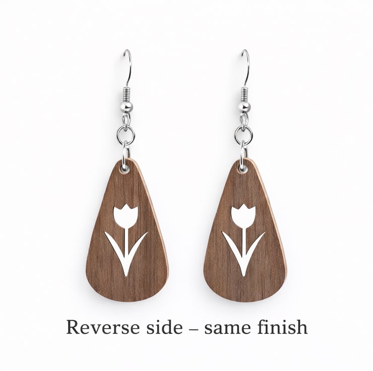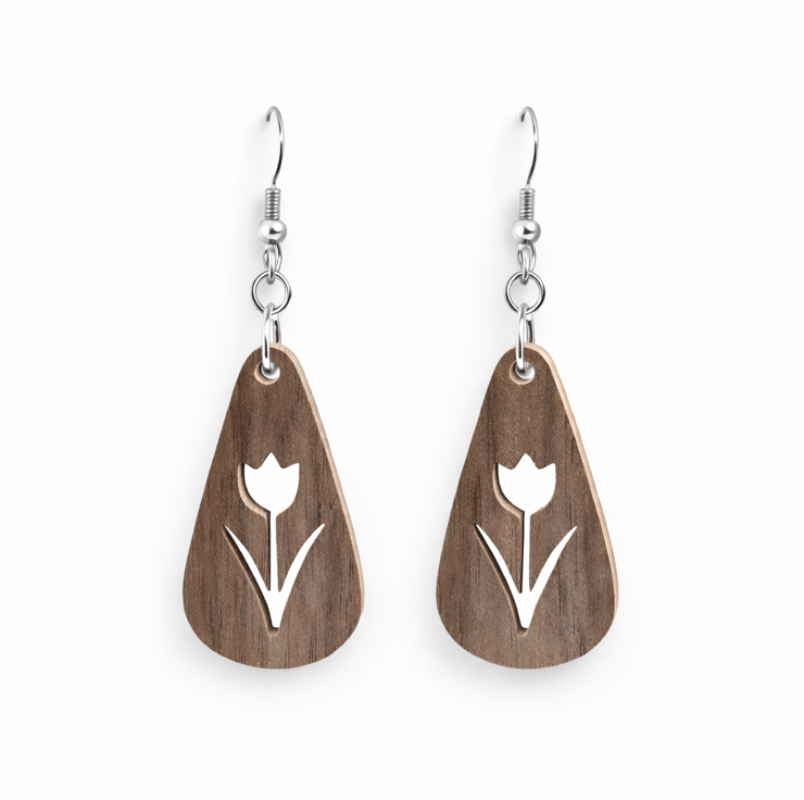 These delicate tulip earrings are carefully scroll saw cut from 3 mm veneered plywood and lightly finished to highlight the natural wood grain. Their simple floral design makes them easy to wear every day while still adding a lovely handmade touch.