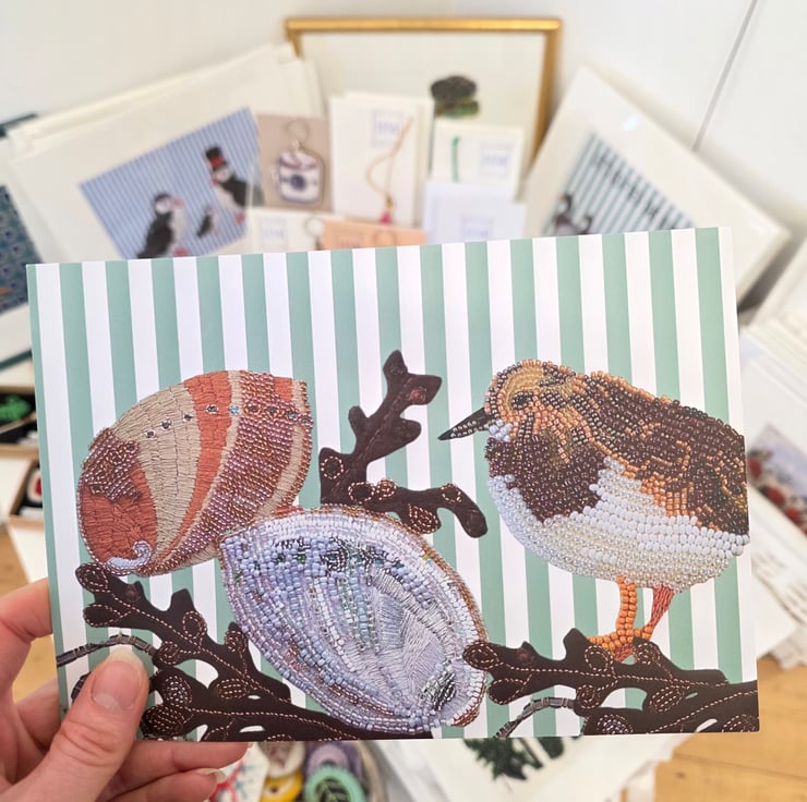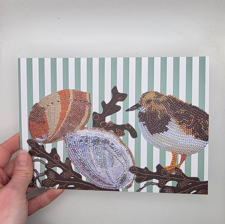 Celebrate coastal wildlife with this Turnstone art print, inspired by the shores of Guernsey in the Channel Islands. This detailed design features a Turnstone standing beside two ormer shells – one revealing its soft, pearly interior and the other showing its textured outer shell – with brown seaweed scattered across a fresh green and white striped background. The vertical stripes add a gentle contemporary feel while keeping the focus on the natural coastal elements.
