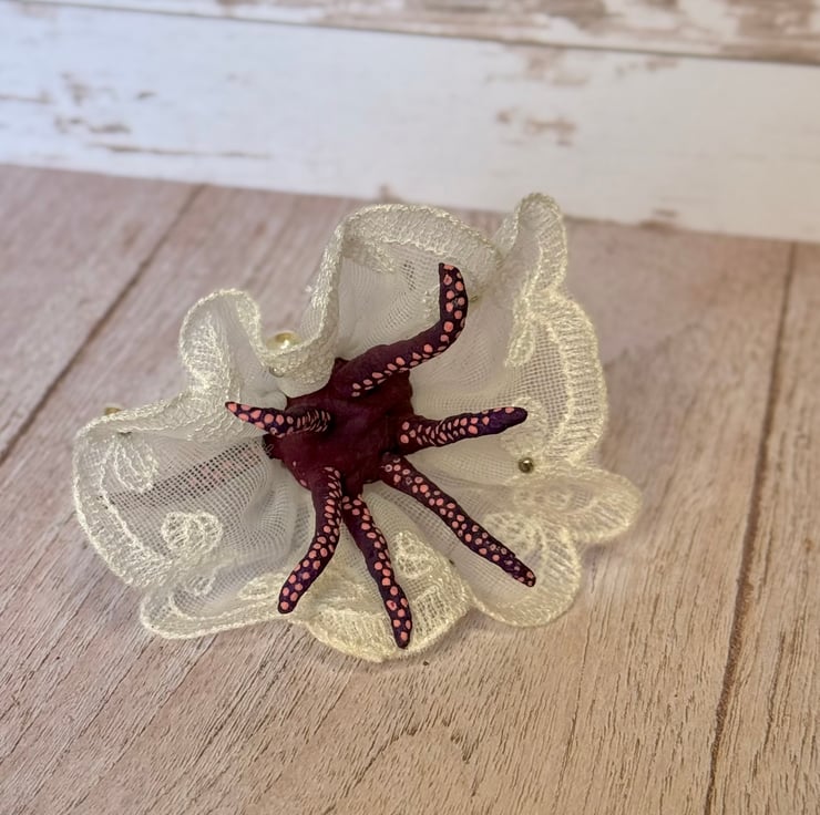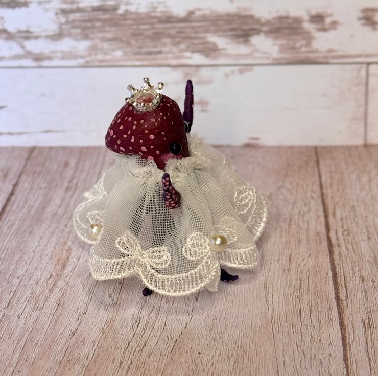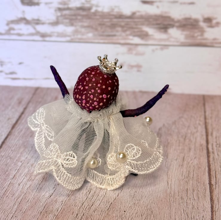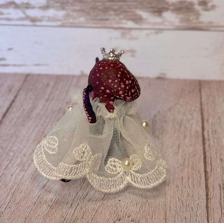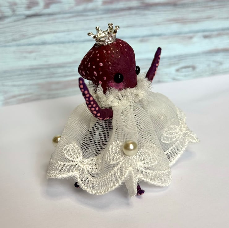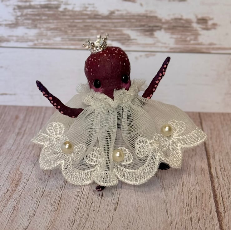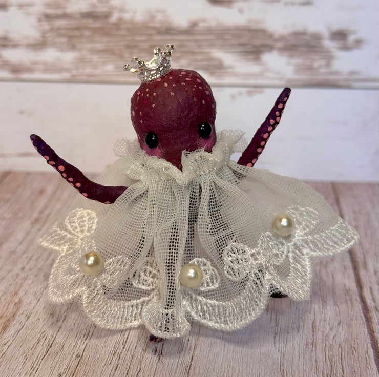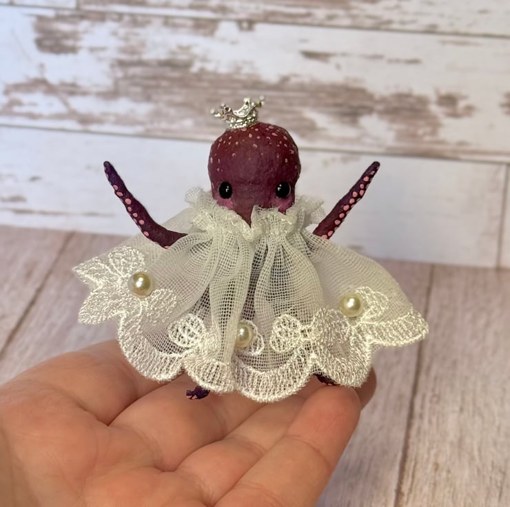 Tiny purple and red octopus made using spun cotton. Octopus is completely hand painted with spots and tentacles suckers. Octopus has glass bead eyes and wears pretty trim lace dress decorated with faux pearls. Octopus wears a metal crown and stands roughly cm tall. This is for decorative purposes only and not a toy. Beautifully gift wrapped and sent in recyclable or recycled packaging.