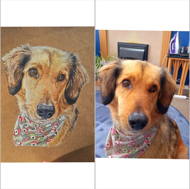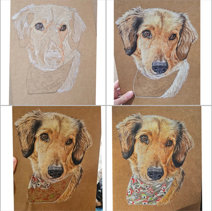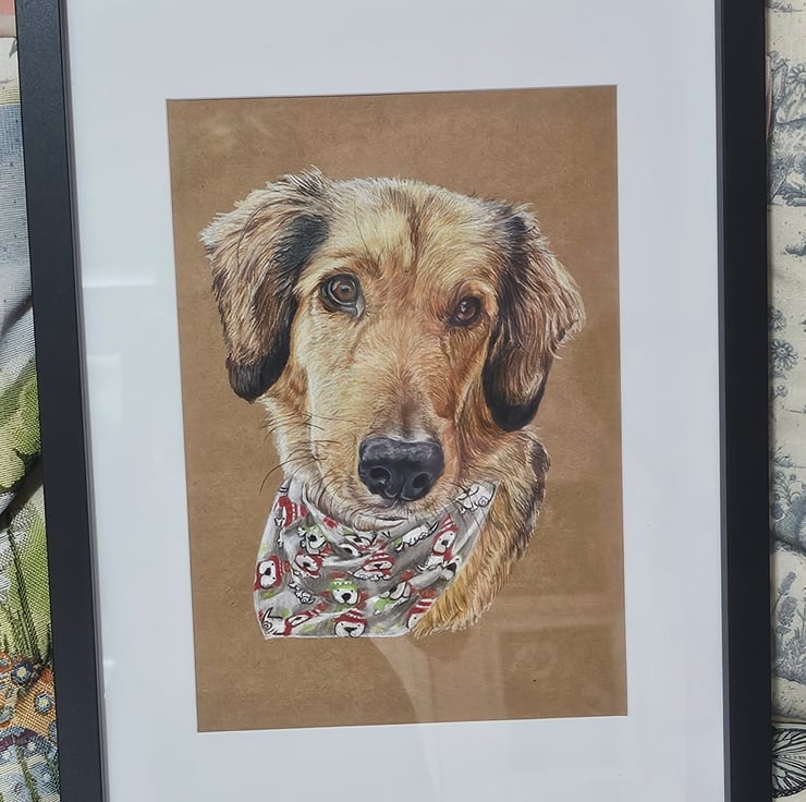 A4 pet portrait drawing done on brown or white card stock, with coloured pencils.