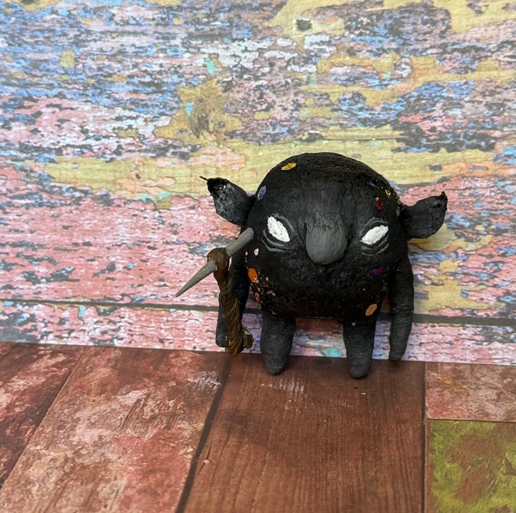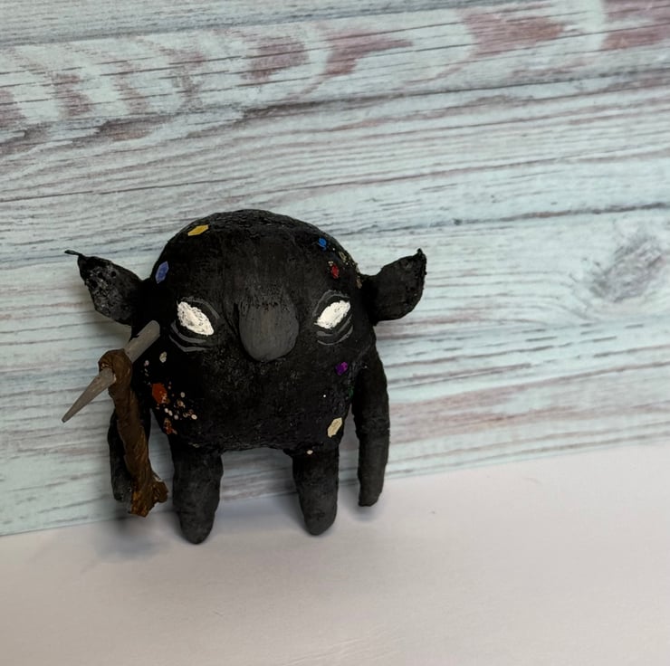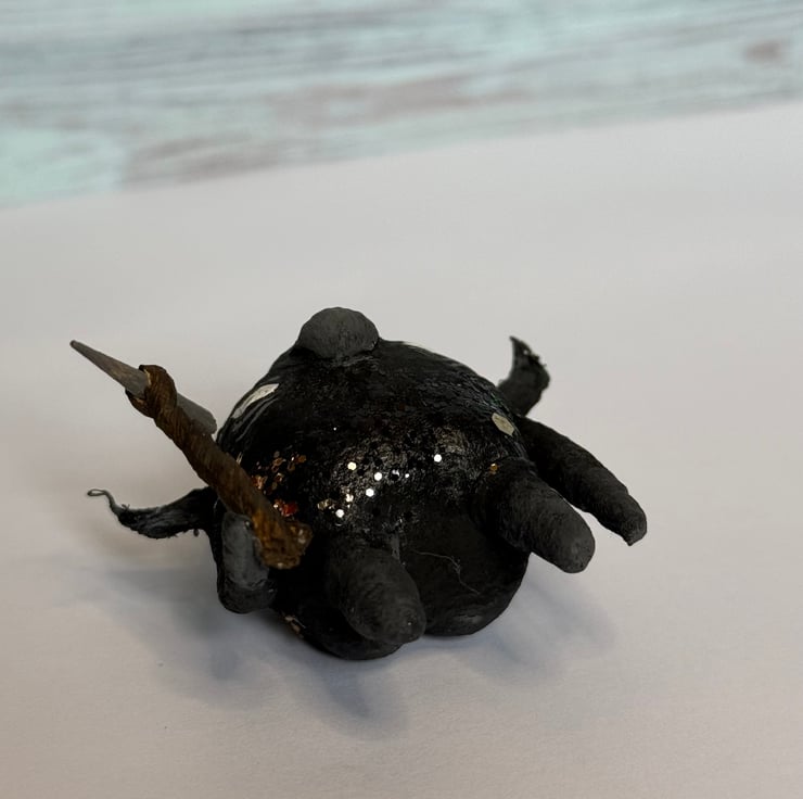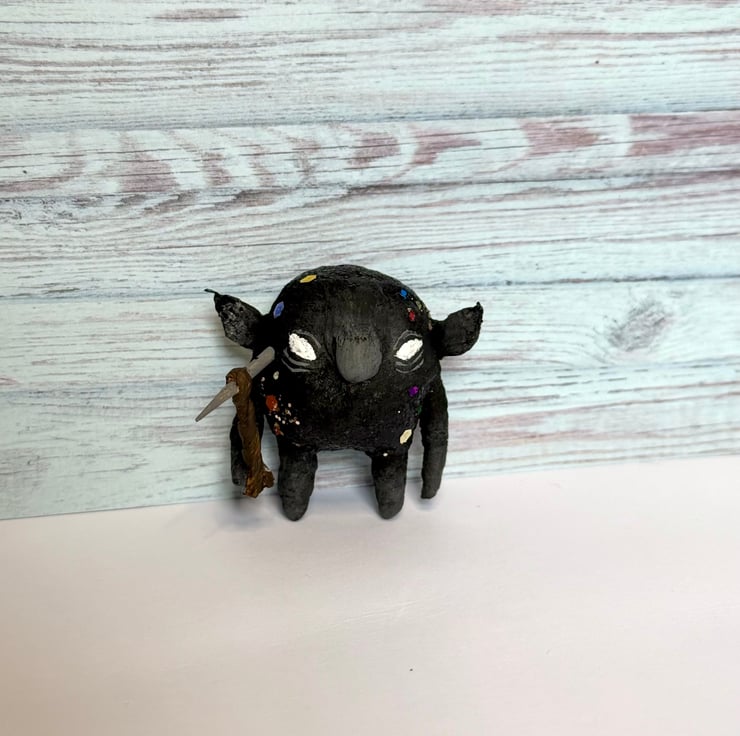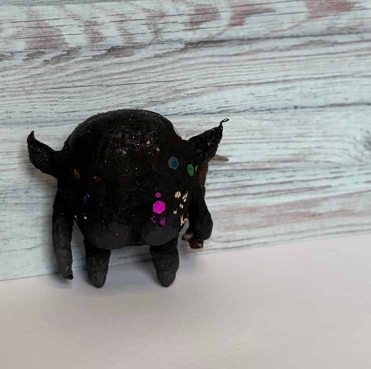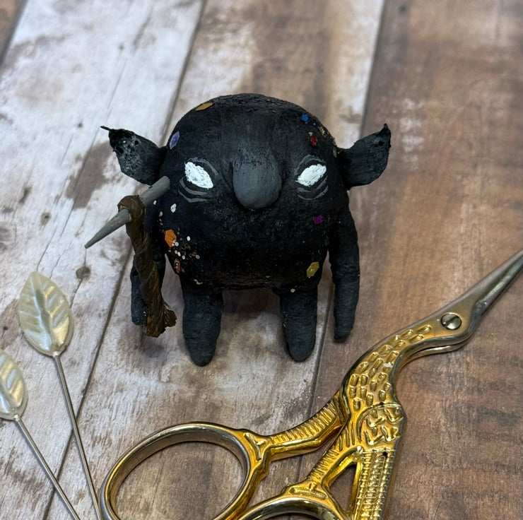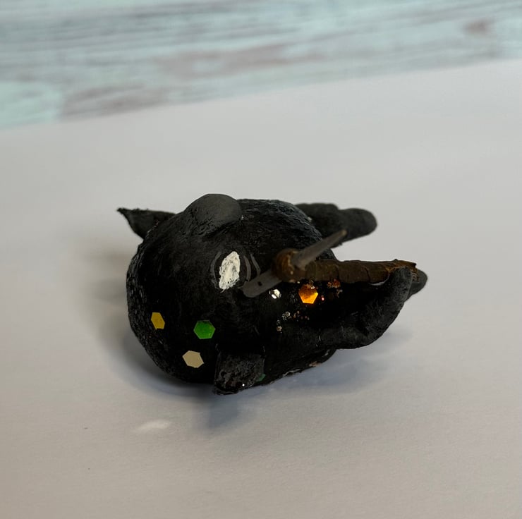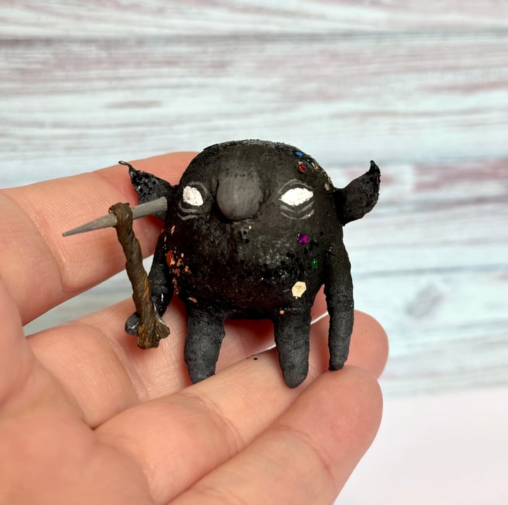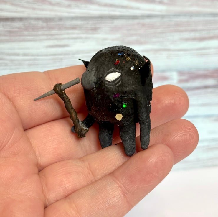 Miniature spun cotton art dolll with wire frame. This doll is entirely hand painted and decorated in multi coloured glitter flecks symbolising the ore, gems and coal found in mines. Coblyn holds a tiny handmade and hand painted pick axe. This Coblyn is one of the smaller two and measures roughly 4.5cm tall.