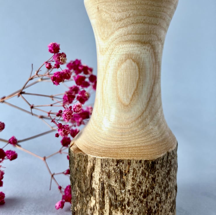 Hand-turned on the lathe, the clean, delicate profile, highlights the natural beauty of the grain that runs through the warm tones of the timber, whilst contrasting them against the darker bark of the live edge base.