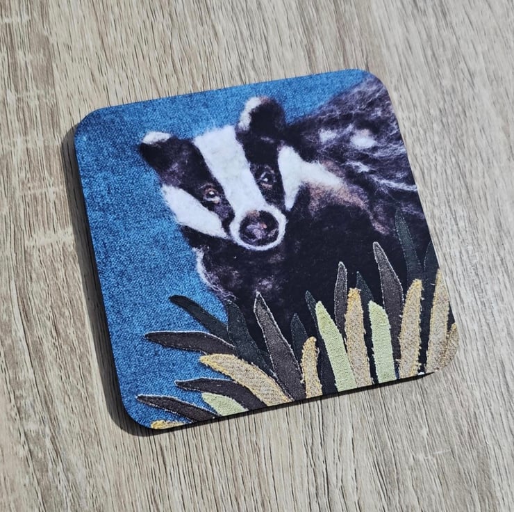 9cm x 9cm glossy coaster of my needle badger piece with a cork backing