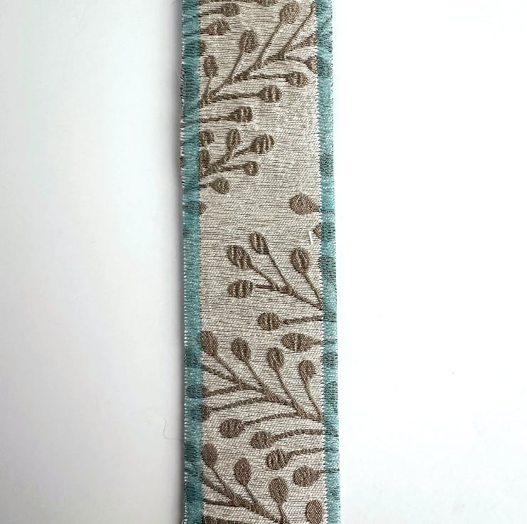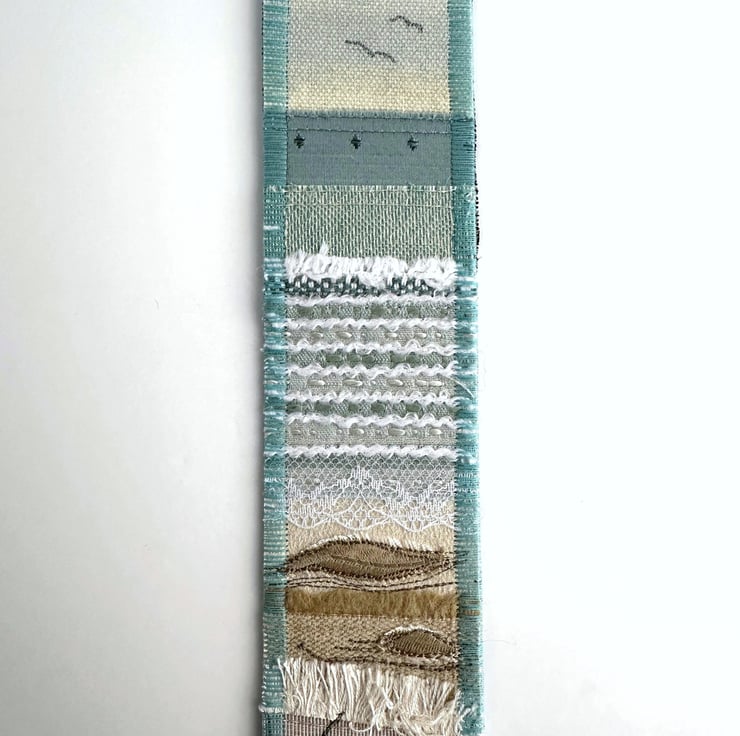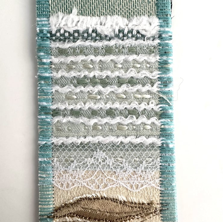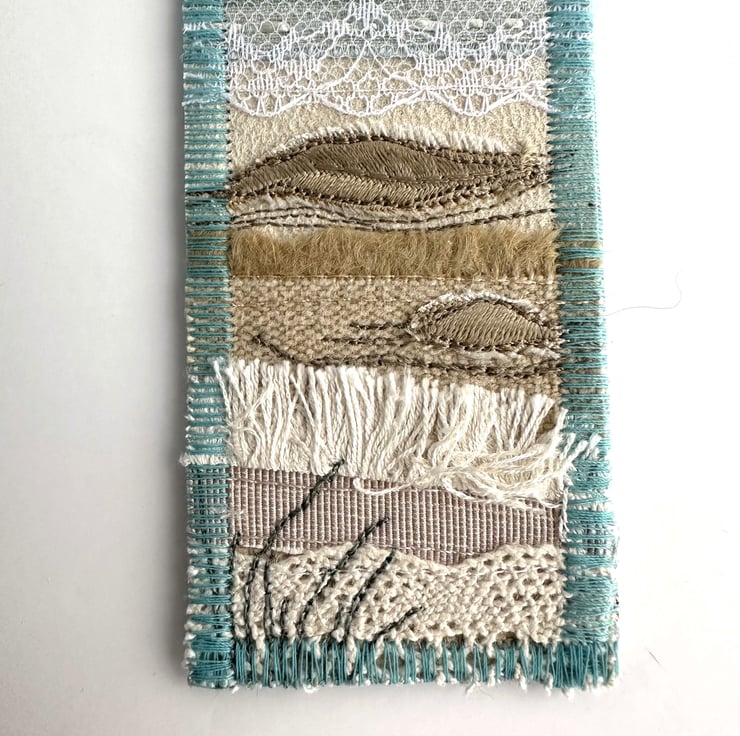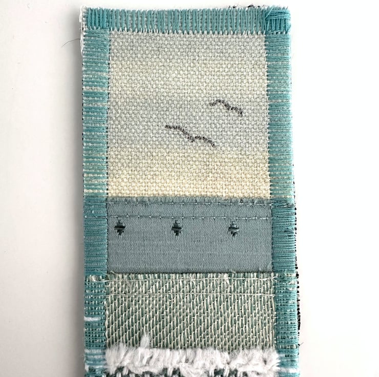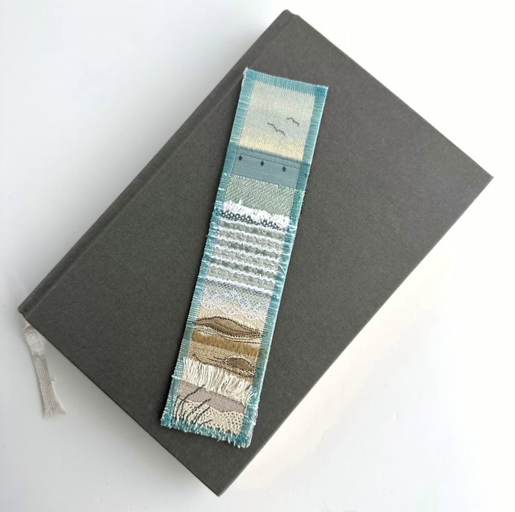 This delightful beach-themed bookmark has been made from a variety of fabric pieces and haberdashery scraps, and has then been free-motion embroidered. It features a sandy and rocky beach with breaking waves, and is depicted in shades of pale blue, duck-egg blue, white, cream and golden-brown. The sky is made from pale blue and cream variegated print fabric. For the sea, I've used fabric strips in various shades of duck-egg blue, some fabric selvedge, white crinkled yarn and white lace. The sand is made from fabric strips and selvedge in shades of golden-brown, cream and beige, along with a strip of cream cotton lace. I've added some appliqué and free-motion machine-embroidered rocks, along with some free-motion machine-embroidered grasses and seagulls.