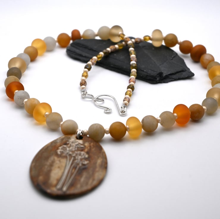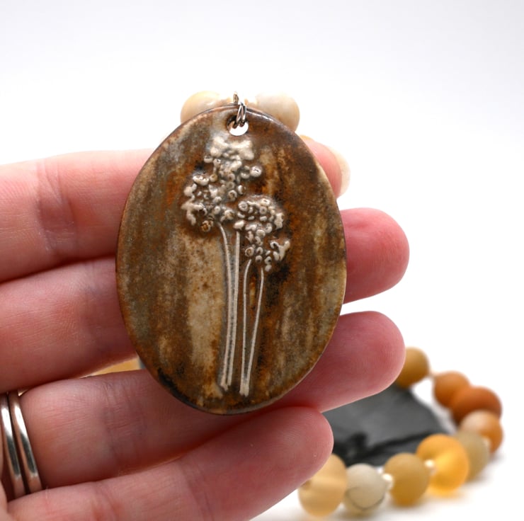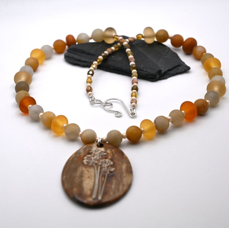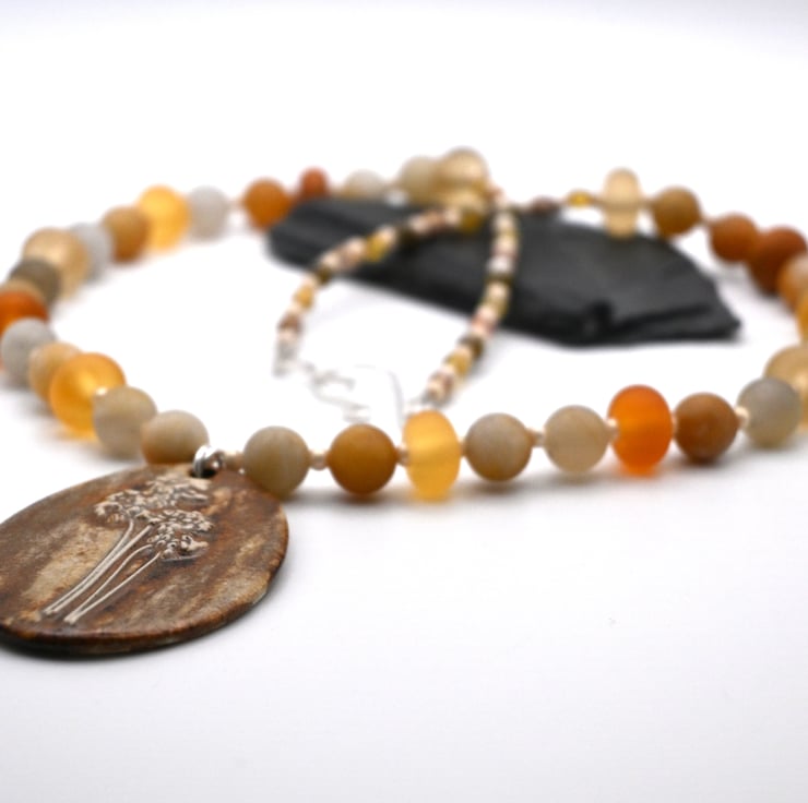 A beaded necklace which features a large handmade ceramic pendant.