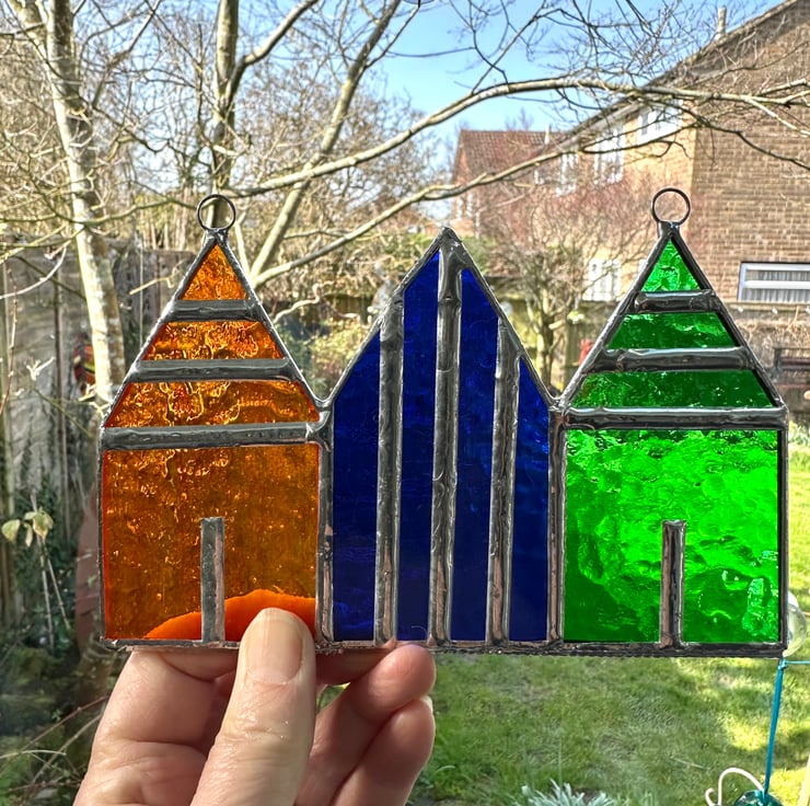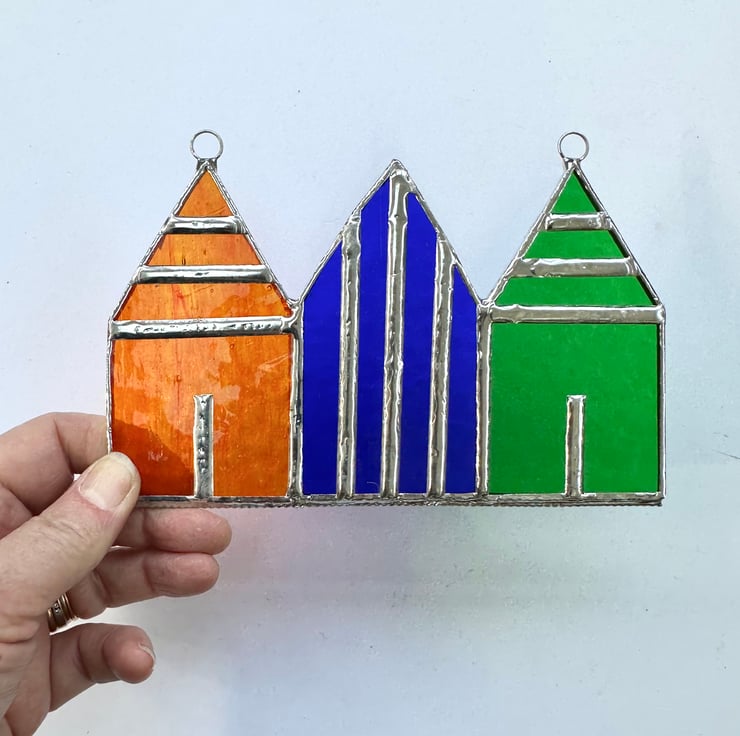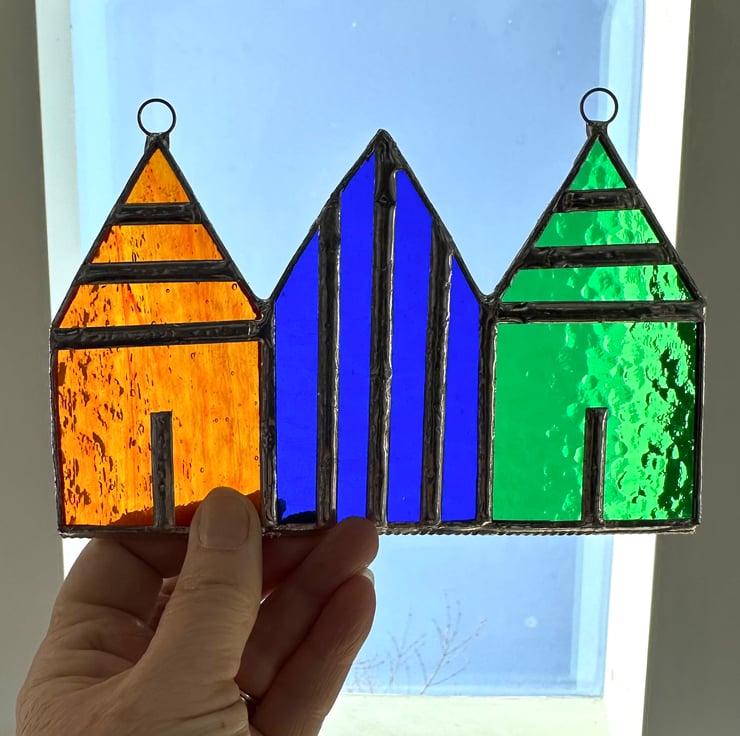 This strip of beach huts has been made from 3 huts which have been made from yellow luna glass, orange luna glass and green corella glass. Each piece of glass has been hand cut, ground and copper foiled before being soldered together then washed again.