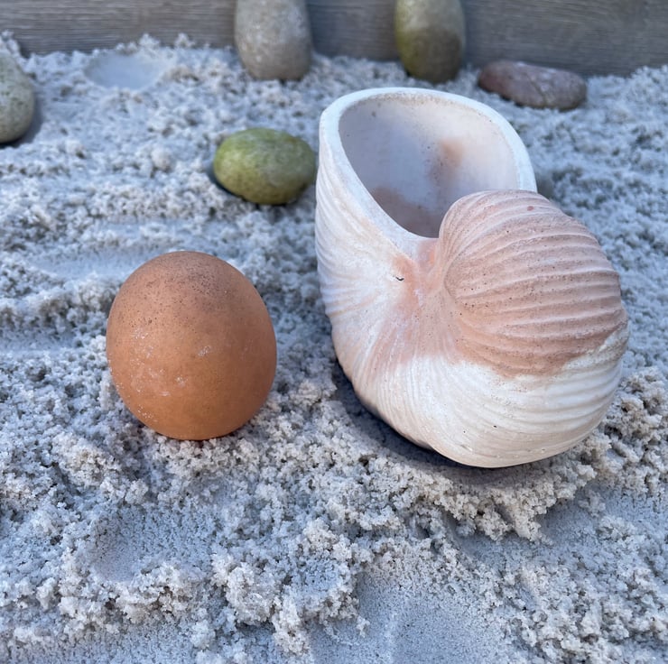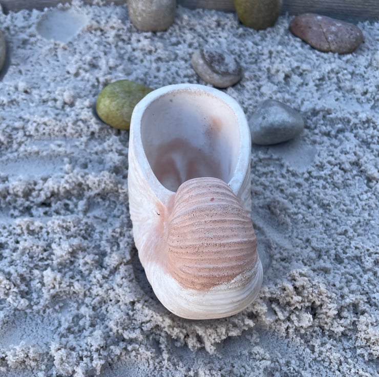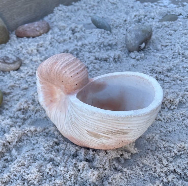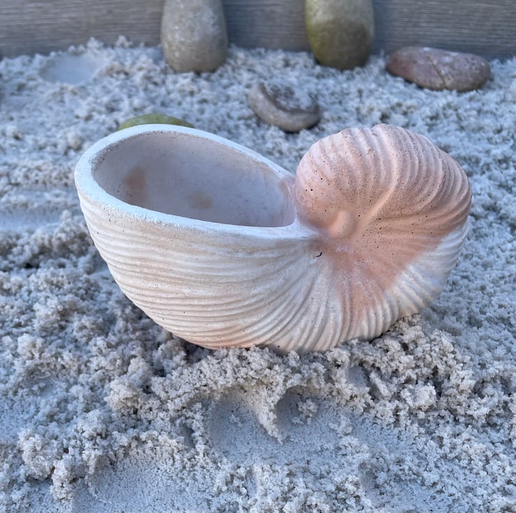 Bring a little coastal calm to everyday life with this handmade nautilus shell trinket dish, cast in white cement and finished with warm terracotta highlights. It’s a small, practical piece that looks beautiful on a bedside table, vanity, bathroom shelf or hallway console.