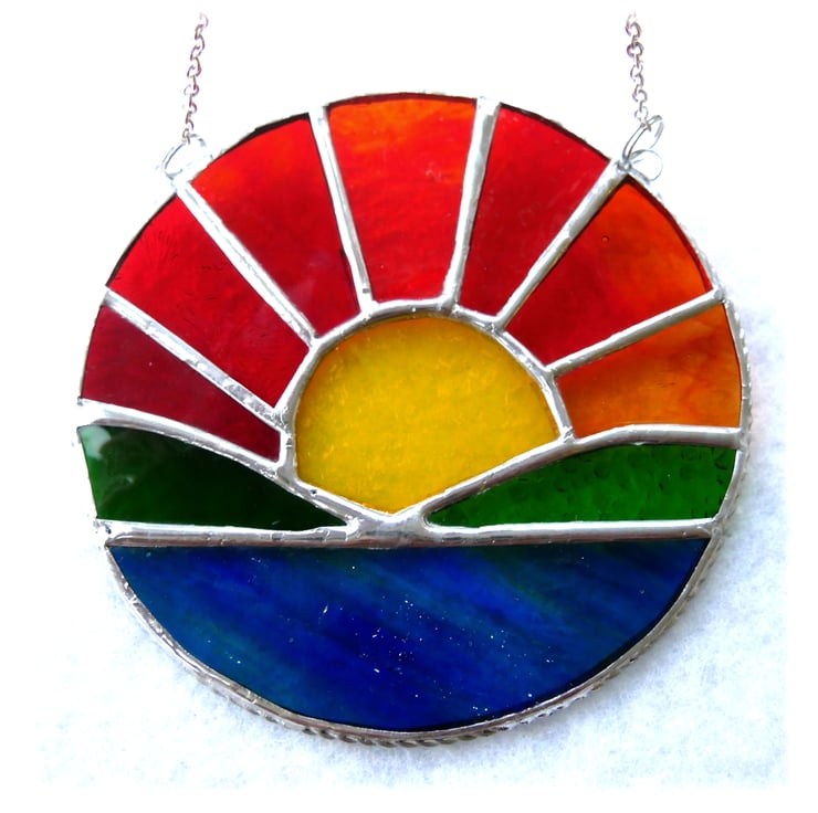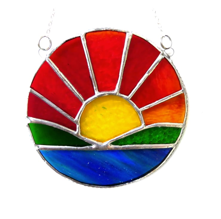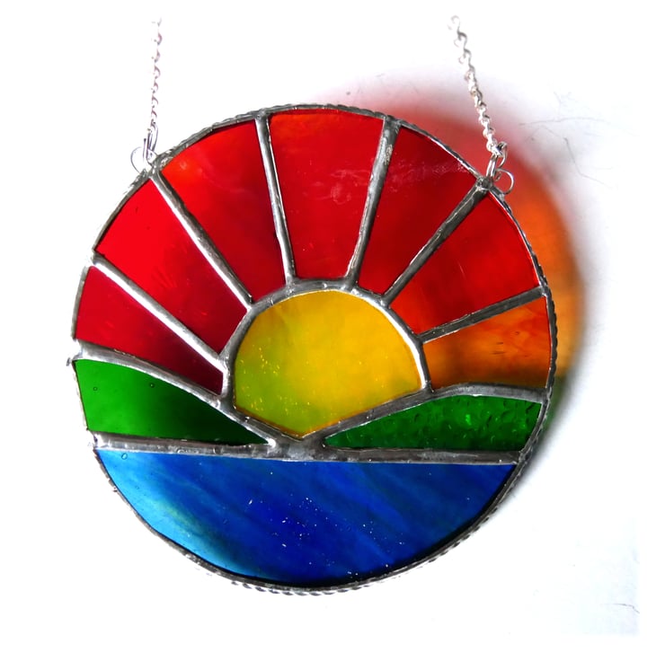 The sun's rays are made from 7 different colours and textures of red, amber and yellow glass with lots of streaks to denote the rays.