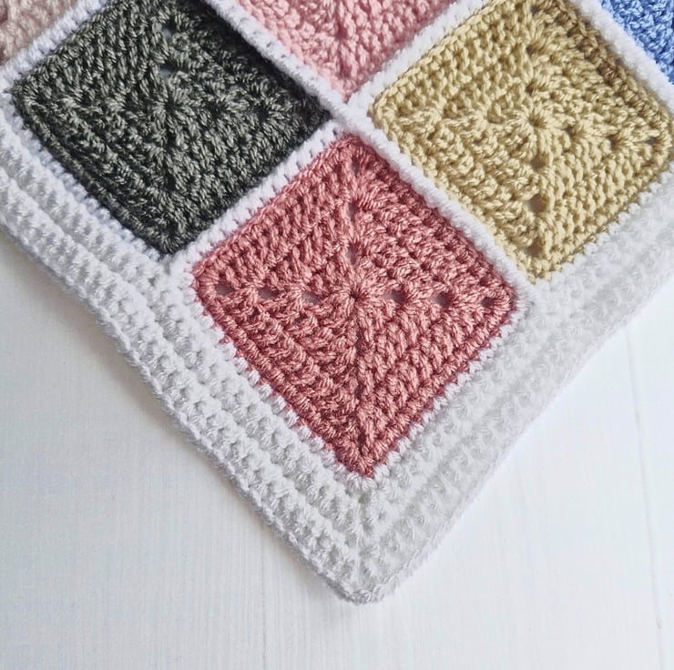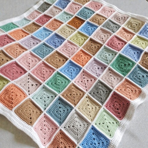 A vibrant handmade crochet baby blanket in a classic patchwork design with 81 individual squares and a neat white border. This unique multicoloured blanket is ready to ship and makes a lovely newborn keepsake or baby shower gift.