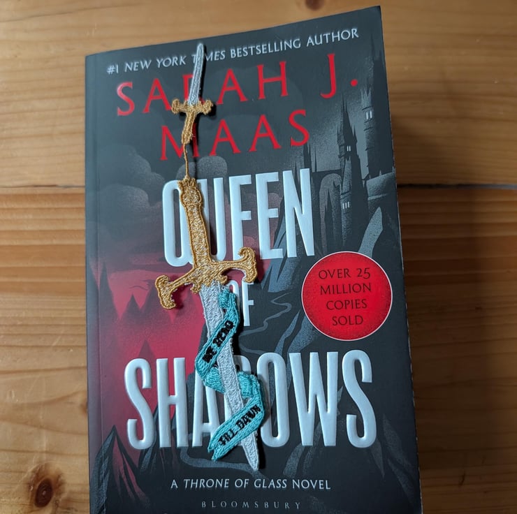 This machine embroidered sword bookmark is a striking book accessory inspired by fantasy tales, dark romance, and epic vows. Featuring a detailed golden hilt, silver blade, and a flowing teal banner stitched with the words We read till dawn, this bookmark is perfect for readers who love stories of loyalty, danger, and devotion.