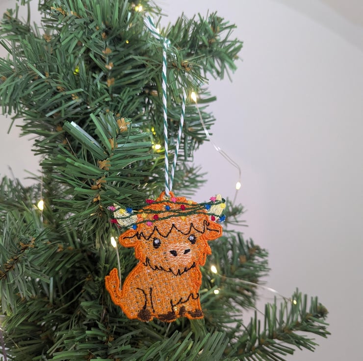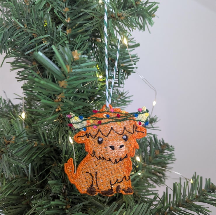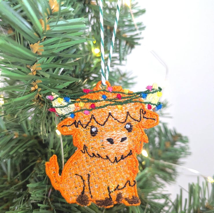 This beautiful machine embroidered christmas highland cow makes the perfect fun addition to your tree.