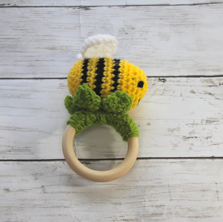 Crochet Bumblebee Wooden Teething Ring, Baby Shower Gift