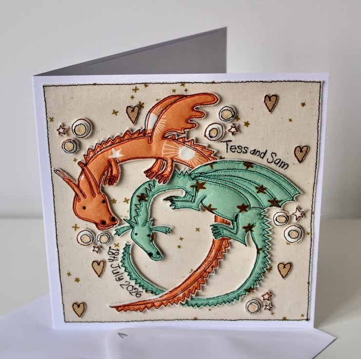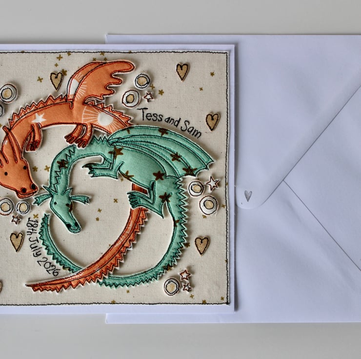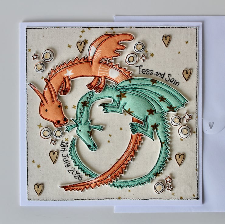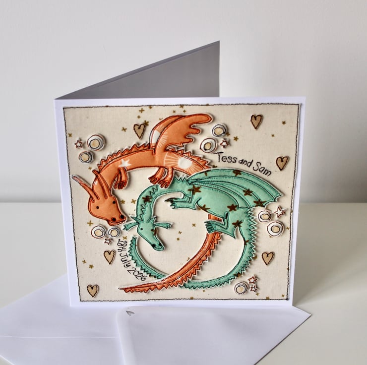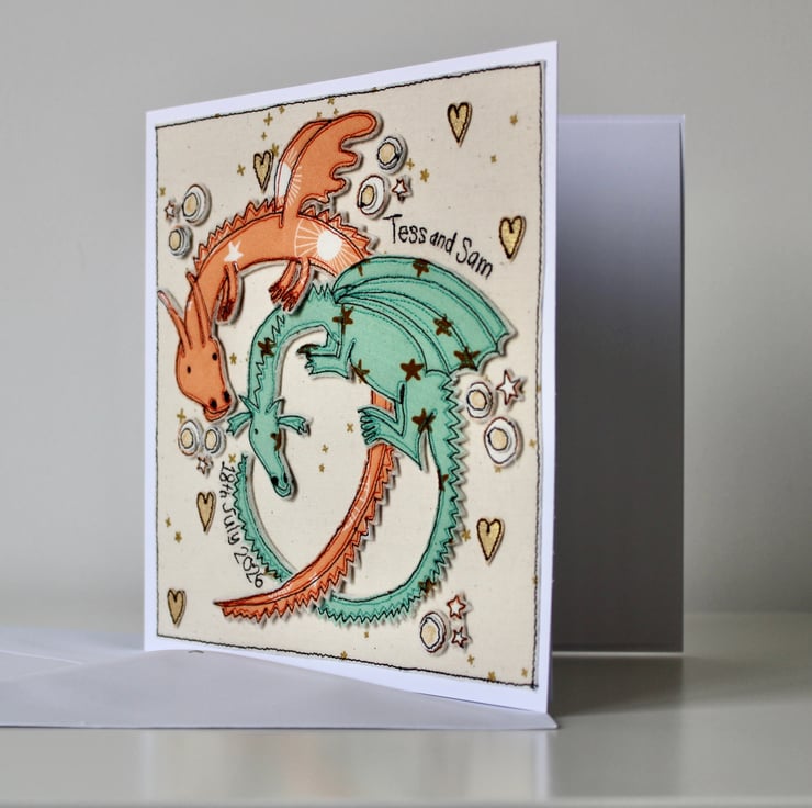 A handmade card which includes two dragons, stars hearts and the stitched words 'Tess and Sam, 18th July 2026'