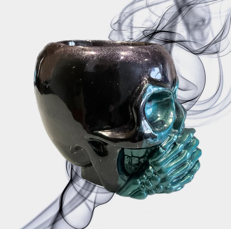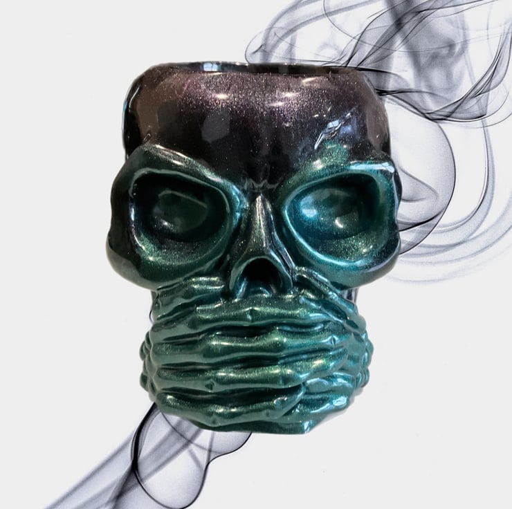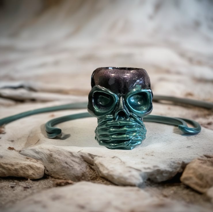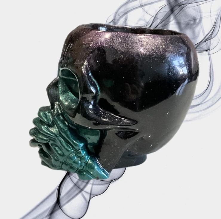 A bold and dramatic handmade resin skull bowl featuring the powerful “Speak No Evil” design. This striking piece showcases a skull with skeletal hands wrapped across the mouth, finished in a mesmerising blend of deep emerald green and shimmering midnight black.