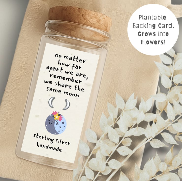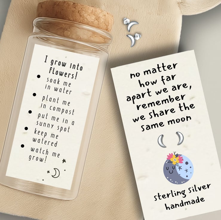 This unique gift includes sterling silver moon crescent earring's, presented on a plantable backing card in a sweet little message bottle with a cork stopper.