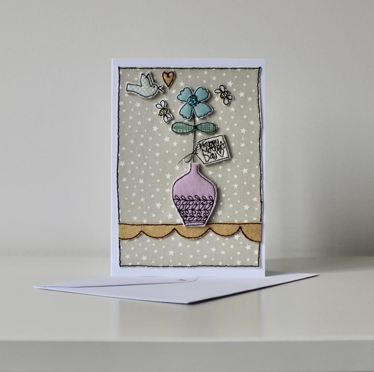 This handmade card has been sewn by me and my sewing machine, using cotton cloth, glitter cloth and metallic fabric; making it totally unique.