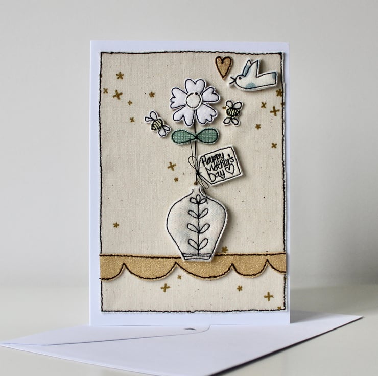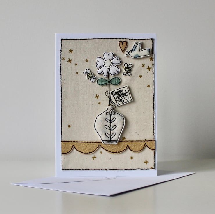 This handmade card has been sewn by me and my sewing machine, using cotton cloth, glitter cloth and metallic fabric; making it totally unique.