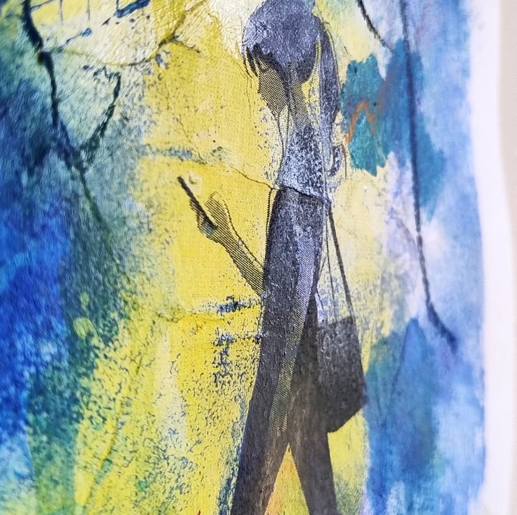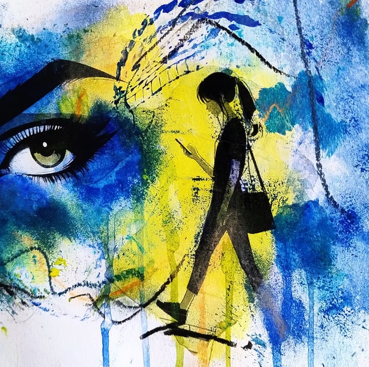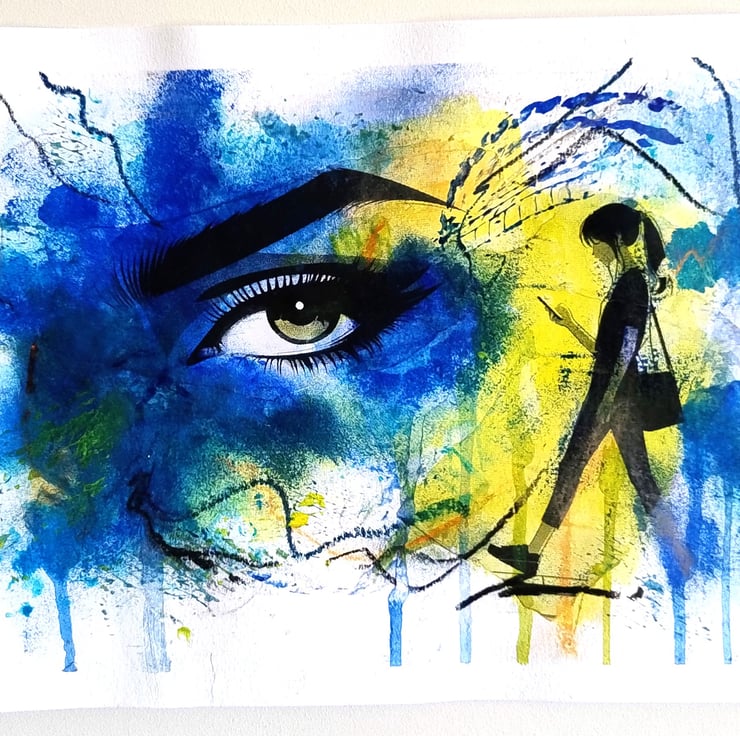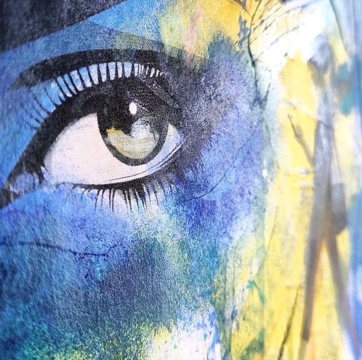 The artwork is a dynamic blend of deep cerulean blues and sun-bright yellows, creating a "halo" effect around the central figure. I have used a combination of acrylic washes, printed cut-outs and charcoal to create a rich texture that ranges from smooth, detailed linework in the eye to raw, energetic drips and scribbles at the edges.