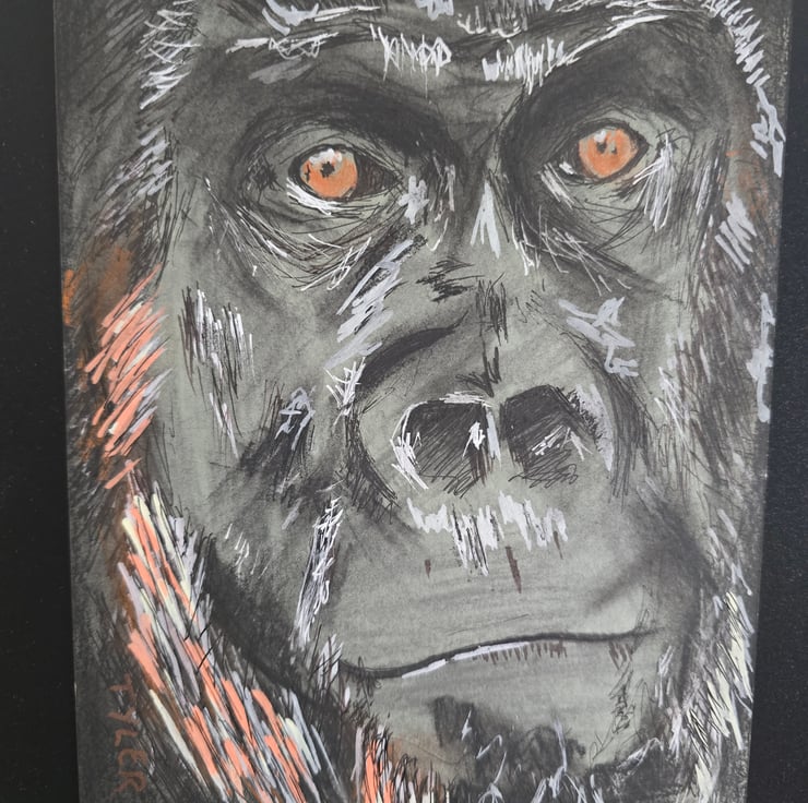 A powerful, expressive portrait that captures the raw presence of a gorilla through bold strokes, glowing orange highlights, and a gaze that feels impossibly alive.
